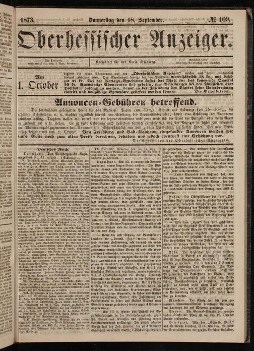 beginnt ein neues Abonnement auf den„Oberhessischen Anzeiger“ welcher auch ferner wöchentlich dreimal erscheinen wird. Das Abonnement beträgt bei den Posistellen vierteljährlich 38 kr., mit Bestell⸗ geld 47 kr. Bei der Verlags- Expedition kostet das Blatt für das kommende Quartal 30 kr. Auswärtige Abonnenten sind gebeten, ihre Bestellungen bei den Poststellen oder Postboten baldigst zu machen, damit in der Zusendung des Blattes keine Unterbrechung eintritt und vollzählige Exemplare geliefert werden können.