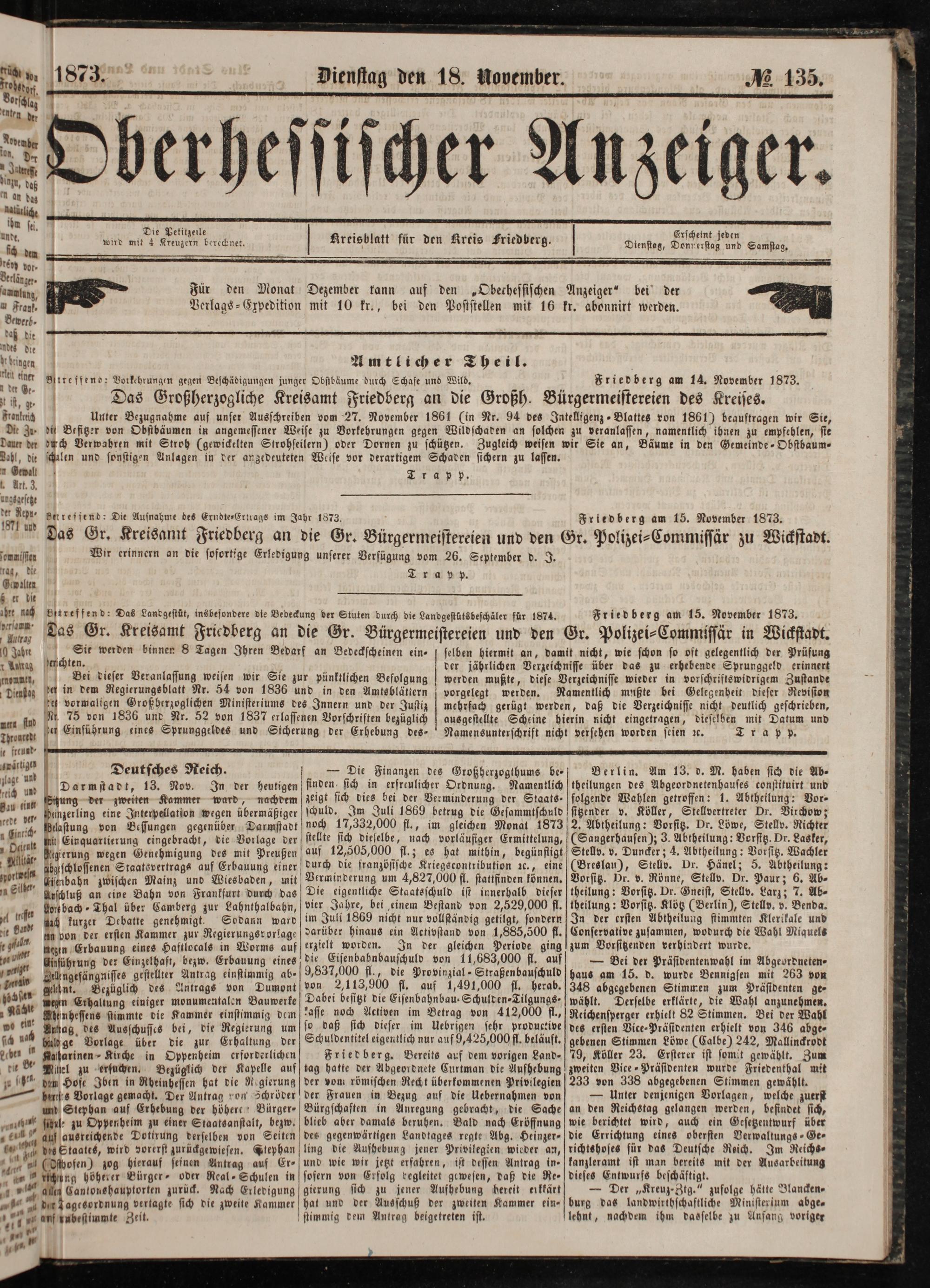 Friedberg am 15. November 1873. Polizei⸗Commissär zu Wickstadt.