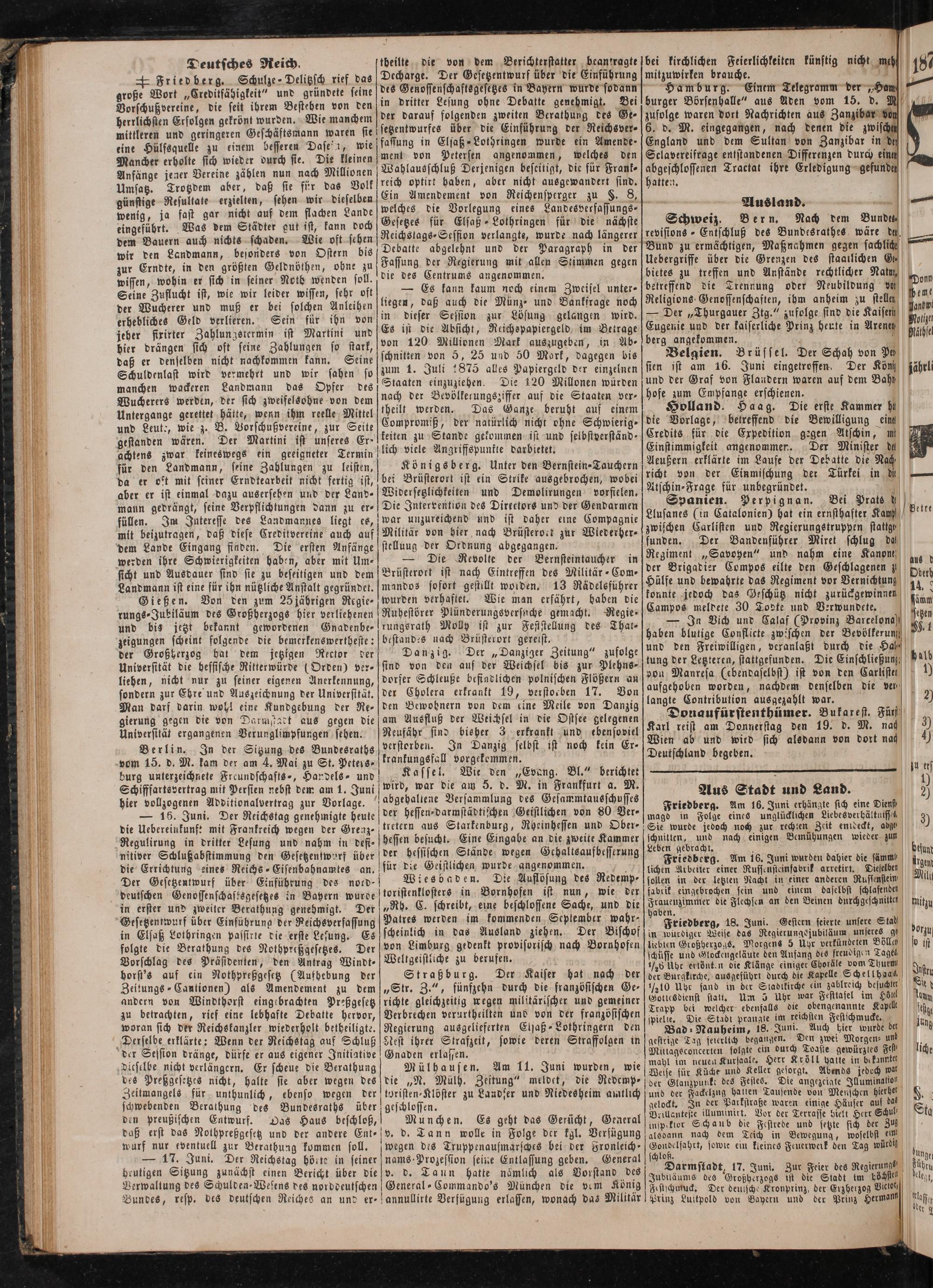 hatten. a Ausland.—— Schweiz. Bern. Nach dem Bunde, revistons Entschluß des Bundesrathes wäre da, Bund zu ermächtigen, Maßnahmen gegen ele Uebergriffe über die Grenzen des staailichen G bietes zu treffen und Anstände rechtlicher Natu, Donn betreffend die Trennung oder Neubildung 0 f 761 Religions Genossenschaften, ihm anheim zu stelleg bub — Der„Thurgauer Ztg.“ zufolge sind die Kaisenn age Eugenie und der kaiserliche Prinz heute in Arenen 11 berg angekommen. 5 Belgien. Brüssel. Der Schah von Po). sien ist am 16. Juni eingetroffen. Der Kön jährl. und der Graf von Flandern waren auf dem Bahy hofe zum Empfange erschienen. 1 Holland. Haag. Die erste Kammer h die Vorlage, betreffend die Bewilligung eint Credits für die Expedition gegen Atschin, W Einstimmigkeit angenommen. Der Minister da Aeußern erklärte im Laufe der Debatte die Nach richt von der Einmischung der Türkei in 1“ Atschin⸗Frage für unbegründet. 7 Spanien. Perpignan. Bei Prats d i Llusanes(in Catalonien) hat ein ernsthafter Kan, Petr zwischen Carlisten und Regierungstruppen statige funden. Der Bandenführer Miret schlug daß Regiment„Savoyen“ und nahm eine Kanont la der Brigadier Compos eilte den Geschlagenen Obel Hülfe und bewahrte das Regiment vor Vernichtung 14. konnte jedoch das Geschütz nicht zurückgewinnen Rau Campos meldete 30 Todte und Verwundete. legen — In Vich und Calaf(Provinz Barcelonaff 95.1 haben blutige Conflicte zwischen der Beraten. und den Freiwilligen, veranlaßt durch die Hal tung der Letzteren, stattgefunden. Die Einschließung bald von Manresa(ebendaselbst) ist von den CarlisteI“ 1 aufgehoben worden, nachdem denselben die ven“ langte Contribution ausgezahlt war. 5 2 Donaufürstenthümer. Bukarest. Fü, Karl reist am Donnerstag den 19. d. M. nac 0) Wien ab und wird sich alsdann von dort na. 0 Deutschland begeben. zu ers l 0 Aus Stadt und Land. 111.5 Friedberg. Am 16. Juni erhängte sich eine Dien, magd in Folge eines unglücklichen Liebesverhältnisse 9) Sie wurde jedoch noch zur rechten Zeit enideckt, abe schnitten, und nach einigen Bemühungen wieder zun Leben gebracht. 8 i biesun Friedberg. Am 16. Juni wurden dahier die sämmt sigen lichen Arbeiter einer Russensteinfabrik arretirt. Dieselben Mil sollen in der letzten Nacht in einer anderen Russenstein⸗ ili fabrik eingebrochen sein und einem daselbst schlafenden Frauenzimmer die Flechsen an den Beinen durchgeschnittel mitzu aben. 5 5 Friedberg, 18. Juni. Gestern feierte unsere Sta“ 5 in würdiger Weise das Regierungsjubiläum unseres 9“ ou liebten Großherzogs. Morgens 5 Uhr verkündeten Bölley so ist schüsse und Glockengeläute den Anfang des freudigen Taget ½6 Uhr erlönten die Klänge einiger Choräle vom Thurm IN der Burgkirche, ausgeführt durch die Kapelle Schellhaath 9 U ½z10 Uhr sand in der Stadtkirche ein zablreich besuchee Skt Gollesdienst statt. Um 5 Uhr war Festtasel im Hol un Trapp bei welcher ebenfalls die obengenannte Kapill fed spielie. Die Stadt prangte im reichsten Fesischmucke. jun Bad Nauheim, 18. Juni. Auch hier wurde de 0 gestrige Tag feierlich begangen. Den zwei Morgen⸗ und 5 Mittagsconcerten folgte ein durch Toaste gewürzles Fesn licht mahl im neuen Kursaale. Herr Kröll yatte in bekanntes Weise für Küche und Keller gesorgt. Abends jedoch wal der Glanzpunkt des Festes. Die angezeigte Illuminaliol und der Fackelzug hallen Tausende von Menschen hierhet g. N gelockt. In der Parkstraße waren einige Häuser auf das S f Brüllanteste illuminirt. Vor der Terrasse hielt Herr Schul⸗ ta inspeklor Schaub die Festrede und setzte sich der A 0 alsdann nach dem Teich in Bewegung, woselbst eim e sowie ein kleines Feuerwerk den Tag würdil lun chloß. ungen Darmstadt, 17. Juni. Zur Feier des Regierung“ ubm Jubiläums des Großherzogs ist die Stadt im höchstel delegt Fesischmuck. Der deulsche Kronprinz, der Erzherzog Victoh Prinz Luitpold von Bayern und der Prinz Herman ste