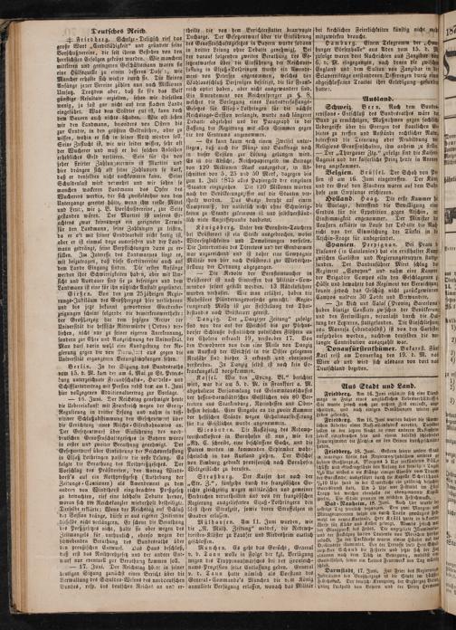 wurf nur eventuell zur Berathung kommen soll. — 17. Juni. Der Reichstag hörte in seiner heutigen Sitzung zunächst einen Bericht über die Verwaltung des Schulden⸗Wesens des norddeutschen Bundes, resp. des deutschen Reiches an und er—