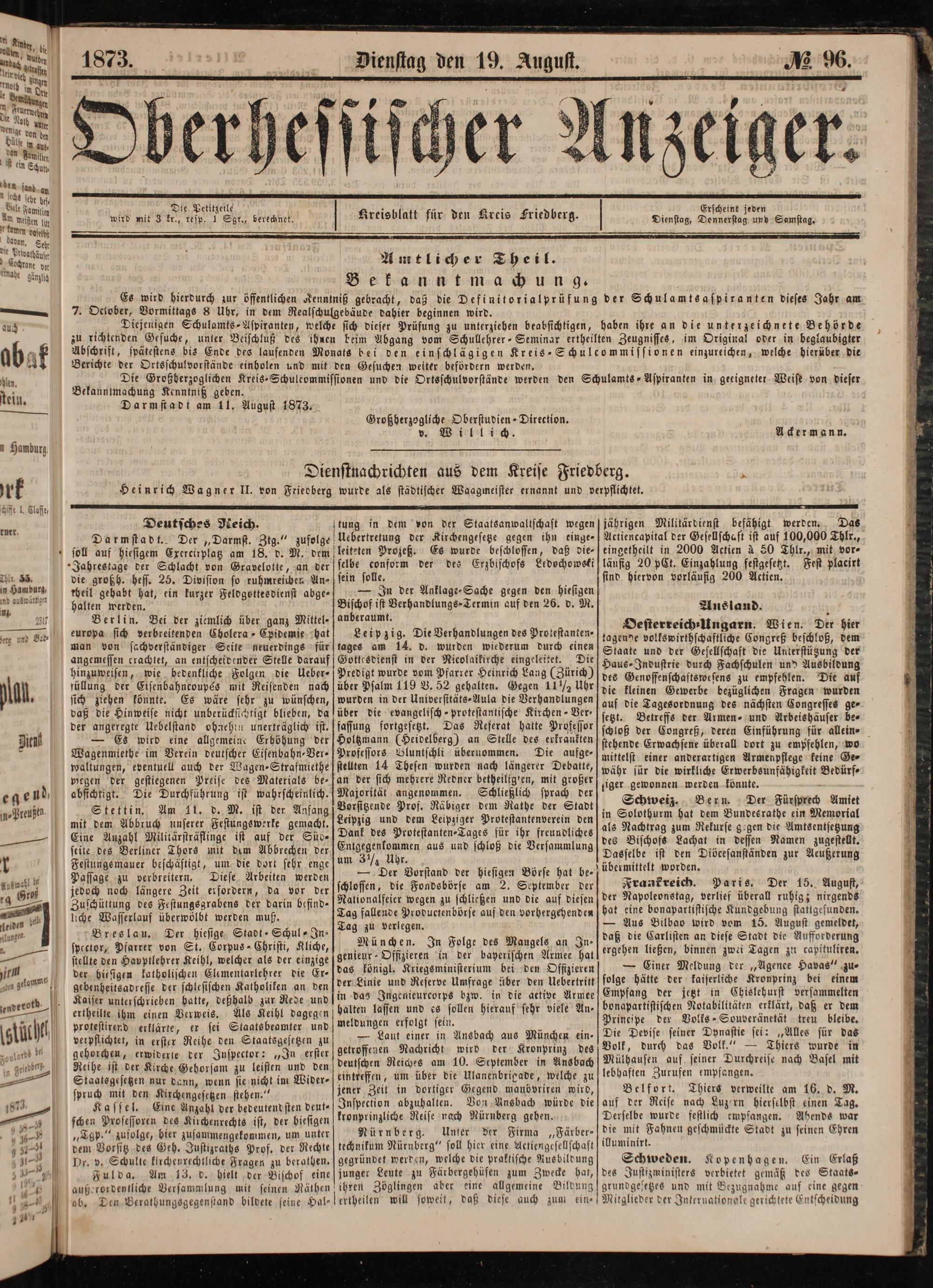 Bekannimachung Kenntniß geben. Darmstadt am 11. August 1873.