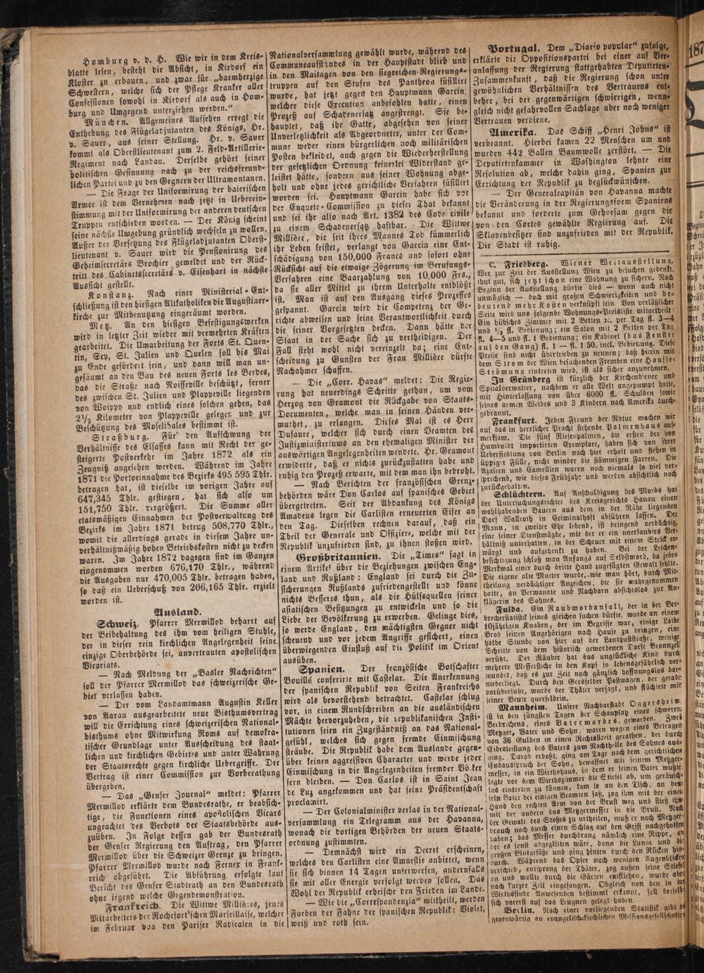 — Die Frage der Uniformirung der baierischen holt und ohne jedes gerichtliche Verfahren füsillirt Errichtung der Republik zu beglückwünschen. Armee ist dem Vernehmen nach jetzt in Ueberein- worden sei. Hauptmann Garcin habe sich vor— Der Generalcapitän von Havanna machte stimmung mit der Uniformirung der anderen deutschen der En nete-Commission zu dieser That bekannt] die Veränderung in der Regierungsform Spaniens 5 Truppen entschieden worden.— Der Körig scheint fund sei ihr also nach Art. 1382 des Code civile bekannt und forderte zum Gehorsam gegen die 1 seine nächsie Umgebung gründlich wechseln zu wollen. zu einem Schadenersatz haftbar. Die Wittwe von den Cortes gewählte Regierung auf. Die 5 Außer der Versetzung des Flügeladjutanten Oberst⸗ Millisre, die seit ihres Mannes Tod kümmerlich Sklavenbesitzer sind unzufrieden mit der Republik. D 1 lieutenant v. Sauer wird die Pensionirung des ihr Leben fristet, verlangt von Garein eine Ent-] Die Stadt ist ruhig. Sohne Geheimsecretärs Brochier gemeldet und der Rück- schädigung von 150,000 Francs und sofort ohne 1 1 tritt des Cabinetssecretärs v. Eisenhart in nächste Rücksicht auf die etwaige Zögerung im Berufungs-] C. Friedberg. Wiener Weltausstellung. at ö Aussicht gestellt. Verfahren eine Baarzahlung von 10,000 Frs., Wer zur Zeit der Ausstellung Wien zu besuchen gedenkt hahn * Konstanz. Nach einer Ministerial Ent- da sie aller Mittel zu ihrem Unterhalte entblößt. Wenn Wohnung zu sichern. Nuch aß