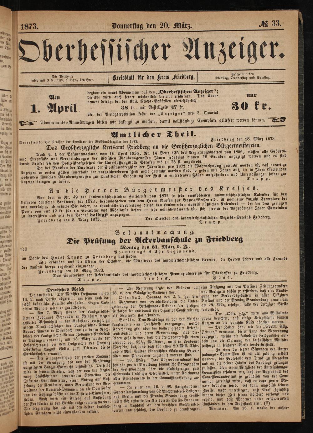 der Anstalt hierzu ergebenst einzuladen. Friedberg den 18. März 1873.