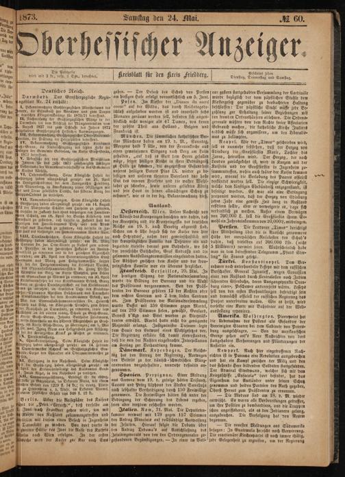 — V. Uebersicht der von Großherzoglichem Ministerium Otenburg dt Innern für das Jahr 1873 genehmigten Umlagen kwpen das zr Bestreitung der Communalbedürfnisse in den Gemeinden indeß den s Kreises Alsfeld. f VI. Ordensverleihung. Seine Königliche Hoheit der den turle⸗ Hoßherzog haben allergnädigst geruht: am 26. April auffnann din Lanogerichtsdiener bei dem Landgerichte Friedberg, en 1400 Prob Cronenberg, in Anerkennung seiner 50jährigen mit 1 Mörser Aer und Treue geleisteten Dienste, das silberne Kreuz des Rilipps⸗Ordens zu verleihen. f g VII. Namens veränderungen. Seine Königliche Hoheit u ist am Großherzog haben allergnädigst geruht: am 14. August achrichten 172 der Margarethe Schäfer von Harheim zu gestatten, on Cbiwa dl dieselbe in Zukunft statt ihres bisherigen den Familien⸗ inen Schudt, am 18. April der Bertha Kisseberth von aden zu gestatten, daß dieselbe in Zukunft statt des
