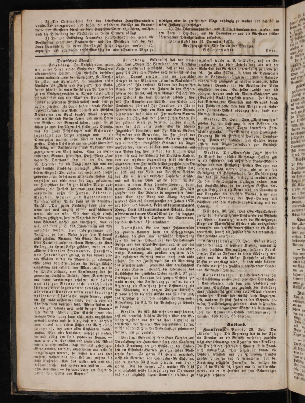 ultramontaner Candidat bat sich dagegen gericht hat die Nichtiglesta. Beschwerde des Bischofs von Spever(Haneberg) betreffs der Beleidigungs⸗ Klage der Martin'schen Eheleute als unbegründet Darmstadt. Bei dem letzten Zusammensein verworfen und den hatte der Gesetzgebungs⸗ f verurtheilt, sonach die Zuständigkeit des ordentlichen eine vorläufige Besprechung Strafgerichts anerkannt.