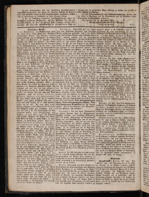 E. Friedberg. In Nachstehendem geben wir unsern Lesern einige Stylproben Münchener ultramontaner Blätter. Die Verfasset derselben dienen natürlich„nur der Wahrheit“, sie kämpfen für„Gott und Paterland“, sie wünschen nichts sehnlicher als„Recht und Freiheit“. Der Volks- freund schreibt in einem Artikel vom 28. December zu den Reichstagswahlen u. N. wie folgt:„Die Liberalen find dem das Mark des Natlonalwobl- standes aufzehrenden Militärmoloch noch stets zu Willen gewesen. Zu Hause haben liberale Reichs- tags⸗Candidaten dem Volke alleweil mit hübschen Redensarten den Speck durch's Maul gezogen, und wie sie nach Berlin kamen und ibren Herrn und Meister, den Bismarck sahen, sagten sie zu Allem ja und bewilligten bei Heller und Pfennig, was der große Reichskanzler und Schnaps ⸗ sabrikant von Varzin verlangte und— die Steuerzahler mußten immer tiefer in den Säckel greifen. Diesem Uebel wird nur ein„nicht liberaler“ Reichstag mit Entschiedenheit und Ausdauer ent⸗ gegenzutreten den Muth haben. Eine der übelst⸗ duftenden Blumen jesuitischer Preß⸗ Flora„das baperische Vaterland“ sagt in der Nr. vom 28. December auf dit Frage, was hat uns der erste deutsche Reichstag gebracht?„Alles, nur keinen Segen! Die Lasten sind mehr und größer geworden, die bestehenden Mißssände haben sich vergrößert und viele neue sind dazu gekommen; der Polizeistaat hat sich zur höchsten Blüthe aus⸗ gebildet; die Freibeit hat man ans dem Reich ausgewiesen, außer für Juden, Liberale, Gründer, Gauner und Kartendamen! An einer andern Stelle heißt es in demselben Artikel:„Der zweite Reichstag kann aber— wenn dies noch möglich ist— noch schlimmer werden als der erste. Mit einer allzeit dienst⸗ willigen, gefügigen, servilen Majorität der Liberalen