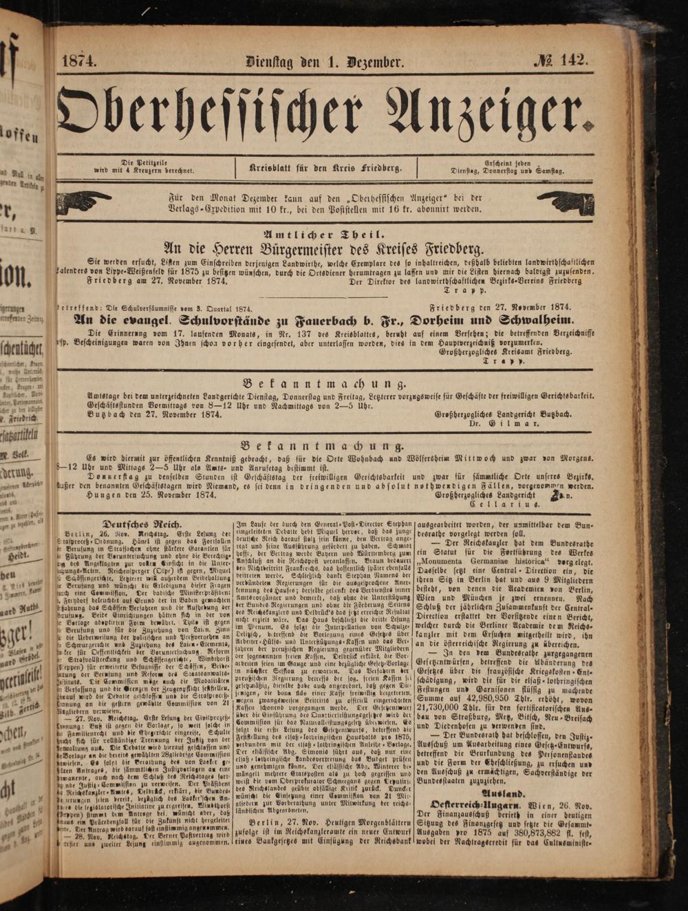 * 1874. Dienstag den 1. Dezember. M 142. loffen b 5 6 1 nd wird ö Kreisblatt für den Kreis Friedberg. Dienstag, La Samstag. A u dn