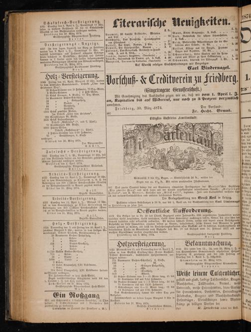 riedberg den 90 Mn wn ger aumert, 80 deulsche Velkslieder. Melodien Mann, Kleine Geographie. 9. Aufl. F Großherzogliche Bürgermeisterei Friedberg. Aa 1a 9 4 l Hel, wee. eee, FTouc arr. Ciwilehegesetz, Das Preußische. Herausgegeben 1 2. Muff.„„%%%%% e ee e Versteige s Anzeige. von Höingbaus.„„ 4 36 Reich, Medle nische Abhandlungen für die Ge⸗ Versteiger 1 n 0 5 8 ze 7 Detleff, Auf Opel 1 9 bl. 3 59 Feen l e 1037 In dem sogen. Lazareth der Burg zu Frledberg[Dewall, Der Spielprofessor. omann 0 8. 40 werden Pen 9. Apel l. F., Vermttage bl Eb, die Haltaug, Das Frenchuuch. Grlebnsse i rant. e a benen, At e ee e daselbst befindlichen aus Fachwerk erbauten Nebenge⸗] reich. 5. und 6. Abbe... 1. 36 Sag 0 0 1 i— dä in Waschküche, Holz Todten⸗ i iter i— 56 Schauenburg, Ueber Cholera und die Prin⸗ däude bestehend in Waschküche, Holzstall und To Jenkin, Jupiter's daughters.(Tauchnitz) 6 b a 10. ihren Ert hp un 1. 12 f kammer in 2 Loosen unter den vorher bekanntgemacht Jüblke, Gartenbuch für Damen, geb. 3. Aufl. 4. 48 cipien und Millel zu ihrer B 1 1 7 85 1 1 4 1 werdenden Bedingungen öffentlich zum Abbruch versteigert.] Naequoid, Too soon by Katharine.(Tauchnitz)— 56 Schumann, Lehrbuch der Pädagogik.. Bd.. R en e ee f Auf Wunsch erfolgen Einsichtssendungen mit Vergnügen Großherzogliches Kreisbauamt Friedberg. a— 3 Carl Bindernagel. — 8 p st 5 g 0— 4 0 Holz⸗Versteigerung. 5. . 4 E 8 N* 1045 Freitag den 10. April, Morgens 10 Ubr, werden ON U— le vereim U Lie E 4 in dem Eschbacher Gemeindewald, Distrikt„Ober dem* W 5 ele cc 31 Festmeter, 72 Dez. Meter 5 8 2 9 Eichen-Stämme von sestmeter, 72 Dez.-Meter, 7. sch f q 6 Birken Stämme 2 Fest⸗ Meter,(Eingetragene Genossenschaft. 7 ück Stang Klass 6 Dez.-Met l a 4 2 5 5 1 8 a 5 C e Mit Genehmigung des Ausschusses zeigen wir an, daß wir vom 1. April l. 3J3.— F an, Kapitalien bis auf Widerruf, nur noch zu 3 Prozent verzinslich! f 79 uchen⸗ 7 Lireslend 44 8 Weichholz, annehmen.. n Friedberg, 30. März 1874. Der Vorstand: 1300 Stück gemischte Wellen, 8 8 g 5 1 Im Distrikt„Ober dem Erleborn“. 997 Fr. Hecht. Ermus. a Nu 290 Gerüststangen 11. Klasse, 18 l.———E—ÿ4—-—¼⸗ 3635 Stück Bobnanstangen, Billigstes illustrirtes Familienblalt:— Distrikt„Wüsteberg“(4. und 2. Theil). 70 Gerüststangen III. Klasse, 6900 Fichten⸗Weslen. b 1 Distrikt„Nassestrauch“(1. Theil). Lu En 3 Fichten⸗Stämme von 0 60 Festmeter, rte · S 25„ Gerüststangen, 1. Klasse 1 fun versteigert. i boch ert Eschbach den 30. März 1874. 5 E Der Bürgermeister 3 S ch mid. app dem 8 8 ungen vo Faselochs-Versteigerung. Ide ape 1042 Dienstag den 7. d. M., Vormittags 10 Uhr, soll cure beg auf dem Rathhause dahier ein der Gemeinde zustehender 41 schwerer Faselochs versteigert werden. 1 6 Wohnbach den 1. April 1874. 1 Großherzogliche Bürgermeisterei Wohnbach. lüdpürse NE Theilen de 5 st e i g Telegrame Arbeits-Versteigerung. 0* 2 1032 Samstag den 11. April l. J., Vormittags 10 Uhr, 17 5 3 1 12 215 ö ˖ e sol in dem e zu Rob heim v. d. H. die Wöchentlich 2 bis 2½ Bogen.— Vierteljährlich 56. 5 der 0 br dessen d Anfertigung von 800[◻UMeter Straßenpflaster öffentlich Bogen nur ca. 1½ kr. Mit vielen prachtvollen Illustrationen. Aöln, an die Wenigstnehmenden in Accord gegeben werden. g f bibel Vilbel den 31. März 1874. 987 Das zweite Quartal bringt die mit Spannung erwarteten Fortsetzungen der Marlitt'schen Erzähluntz 3 Volk„Die zweite Frau“ und wird dann mit der bereits angekündigten interessanten Novelle:„Gesprengte Walen: f beginnen. Zeit- und Culturbilder wechseln daz r loniglic