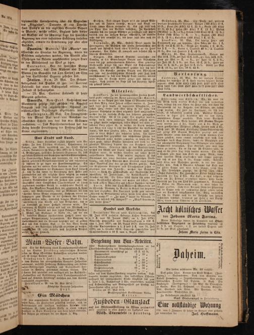 Nidda. Unser Kreisblatt erzählt folgende nette Ge— chichte: In dem Dörschen Gilécourt, Departement des Vosges, eine Meile nordöstlich von der Stadt Epinal zelegen, kantonnirte im Monat Mai 1871 die 5. Comp. des I. Großberzogl. Hessischen In santerie-Regimenie Nr. 116 aud lebten Soldaten und Eiuwohner im besten Einvernehmen. Die Quartierträger kochen und bereiteten die den Mann- chaften gelieferten Victualienportionen zu und behandelten vie letzteren so zu sagen wie Familienangebörige. Die Soldaten auf der andern Seite statteten für das freund— iche Entgegenkommen der Einwohner ihren Dank dadurch ub, daß sie sich ihnen bei Verrichtung ihrer Feld- und Hausarbeiten auf alle mögliche Weise nützlich zu machen uchten. Als ein Veweis dieses gegenseitigen guten und ordialen Verhältnisses und ein Zeichen von großer An— änglichkeit eines französischen Quartierträgers an seinen ungebetenen deutschen Besuch sei nachstehender Vorfall er⸗ Aählt. Der Musketier August Koch der genannten 5. Com- ignie, von Wallernhausen, war zu Girécourt bei dem Schreiner Pierre Michel einquartirt. Nachdem seitens der Zompagnie zum Marsche in die Heimath das Dörschen