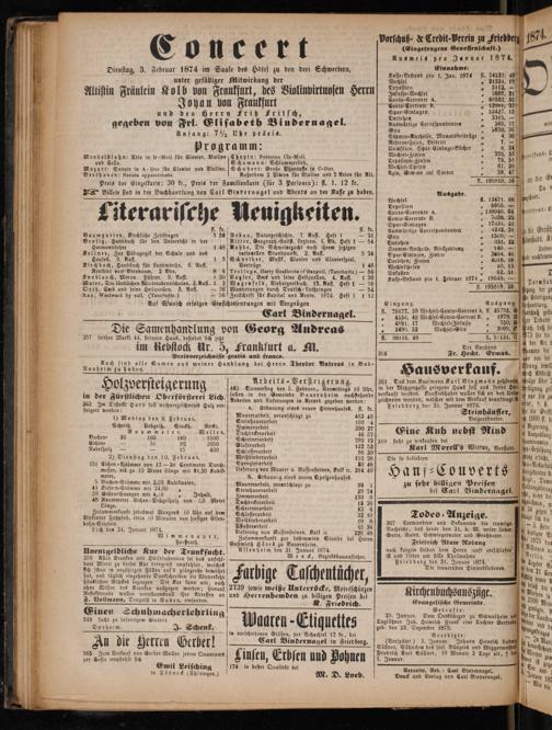 Joyau von Frankfurt und des Herrn Fritz Fritsch, gegeben von Frl. Elisabeth Bindernagel. Anfang: 7½ Uhr präcis.