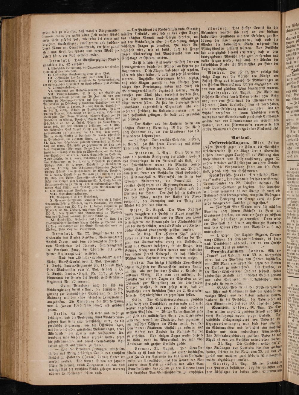 Oesterteich⸗-Ungarn. Wien. In dem großen Proceß gegen die Führer dil steierischen Arbeitervereine ist die Klage bereits überreicht; dieselbe lautet gegen Tauschinki auf Stiftung eines Geheimbundes und Religionsstörung, gegen 32 andere Arbeiter auf Theilnahme an einem Geheim— bunde. Die Verhandlung findet am 10. Sept, statt, jedoch nicht vor Geschwornen. Frankreich. Paris. Der officiöse„Moni, teur“ meldet:„Der Kriegsminister hat dem General— Commandanten der 22. Diviston befohlen, sich nach Bourg-Madame zu begeben. Die Anwesen⸗ heit dieses Generals an der Grenze ist durch die Nothwendigkeit hervorgerufen, energische Maßregeln gegen die Verletzung der Grenze durch die Puy cerda belagernden Carlisten zu ergreifen.“