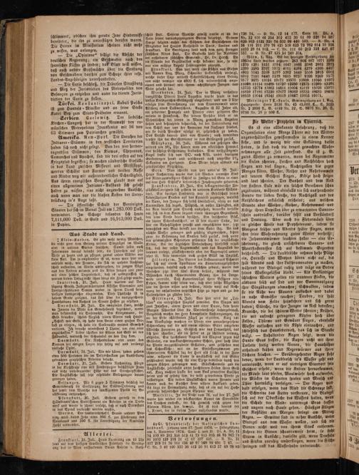 Allerlei. Frankfurt, 31. Juli. Heute Vormittag um 10 Uhr fand auf dem hiesigen israelilischen Friedhofe die Beerdig⸗ ung des in Wien verstorbenen Baron Anselm v. Roth⸗