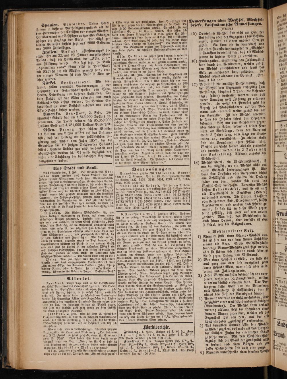 Frankfurt, 2. Febr. Waizen effectiv hies. 17¾ fl., Korn 12/ 13% fl., Gerste 12½—14 fl., Hafer 10½ bis ½ fl., Kohlsamen 16½ fl., Erbsen 12— 14 fl., Wicken 10 fl., Linsen 12—17 fl., Rüböl 39 fl. Alle Preise