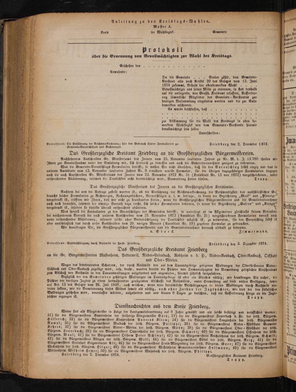 Betreffend: Die Einfübrung der Reichsmarkrechnung; hier den Gebrauch älterer Formularien zu Friedberg den 2. December 1874. 1