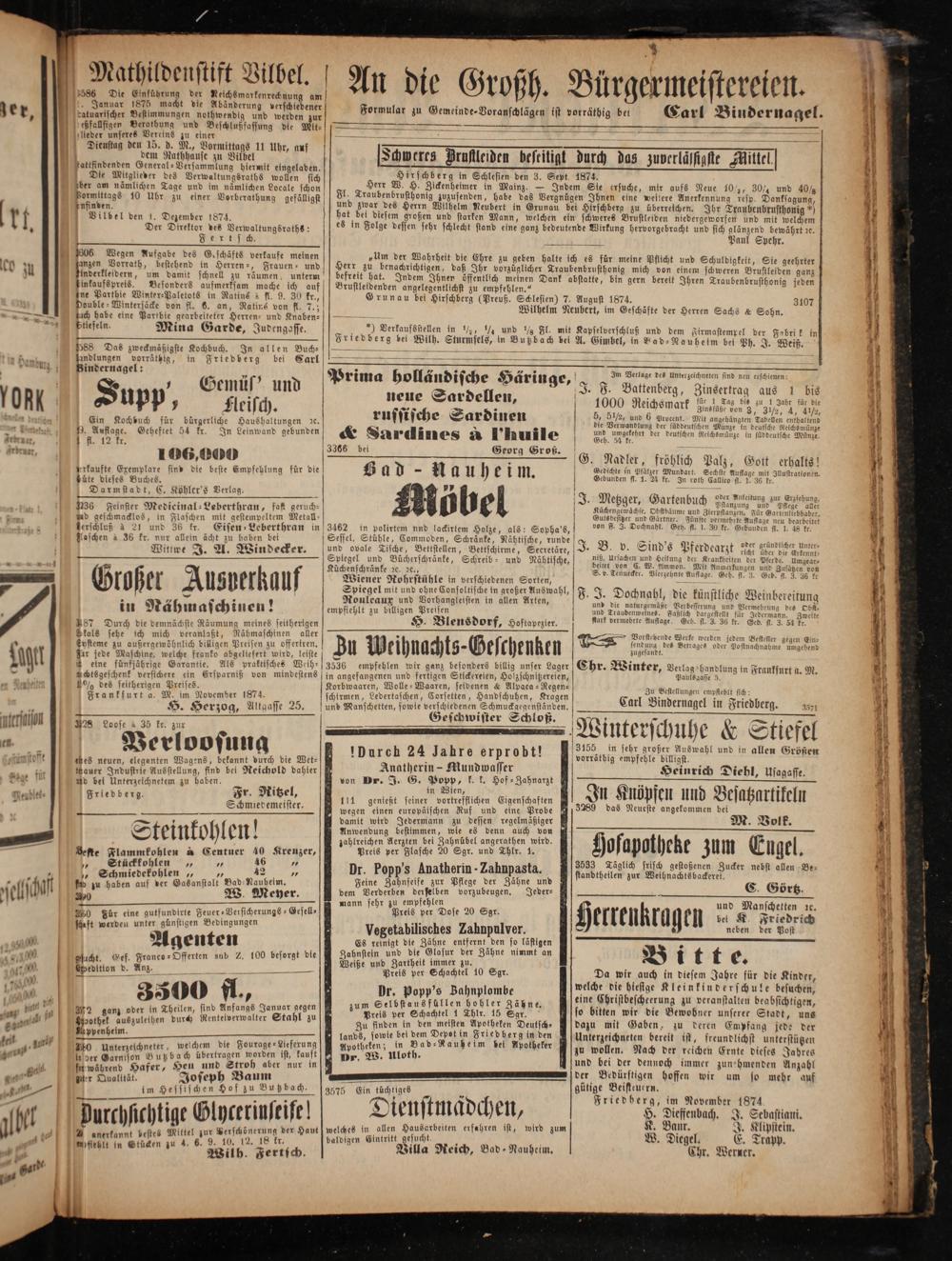 *—* 9* 0 9— ger, Fatuarischer Bestimmungen nothwendig und werden zur Joftulsz zu Gemeinde- Voranschlägen is pie Carl Bindernagel. eßfallsigen Berathung und Beschlußfassung die Mit⸗ D————. ̃ ̃ ôiI——— pp ieder unseres Vereins zu einer——-— 8 3 5———————u—.˙'..— Dienstag den 15. d. M., Vormittags 11 Uhr, auf a 777 7 6 dem Rathhause zu Vilbel Ichmeres Prustleiden beseiligt durch das zuverläßfigste Mittel 4 enger General-Versammlung hiermit eingeladen. l r 0. Die Mitglieder des Verwaltungsraths wollen sich Hirschberg in Schlesten den 3. Sept 1874. 5 ber am nämlichen Tage und im nämlichen Locale schon Herr W. H. Zickenheimer in Mainz.— Indem Sie ersuche, mir aufs Neue 10½, 30½ und 40% FVormittags 10 Uhr zu einer Vorberathung gefälligst Fl. Traubenbrusthonsg zuzusenden, habe das Vergnügen Ihnen eine weilere Anerkennung kesp. Danksagung, ufinden. 8 und zwar des Herrn Wilhelm Neubert in Grunau bei Hirschberg zu überreichen. Ihr Traubenbrusthonig b k! Vilbel den 1. Dezember 1874. hat bei diesem großen und starken Mann, welchen ein schweres Brustleiden niedergeworfen und mit welchem g 11 Der Direktor des Verwaltungsraths: es in Folge dessen sehr schlecht stand eine ganz bedeutende Wirkung hervorgebracht und sich glänzend bewährt ꝛc. Fer t sch. e Paul Spehr. 4 606 Wegen Aufgabe des Geschäfts verkaufe meinen„Um der Wahrheit die Ehre zu geben halte ich es für meine Pflicht und Schuldigkeit, Sie geehrter co zu hanzen Vorrath, bestehend in Herren-, Frauen- und Herr zu benachrichtigen, daß Ihr vorzüglicher Traubenbrusthonig mich von einem schweren Brustleiden ganz 9 inderkleidern, um damit schnell zu räumen, unterm befreit hat. Indem Ihnen öffentlich meinen Dank abstatte, bin gern bereit Ihren Traubenbrusthonig jeden kinkaufspreis. Besonders aufmerksam mache ich auf Brustleidenden angelegentlichst zu empfehlen.“ ine Parthie Winter⸗Paletots in Ratins 3 fl. 9. 30 kr., Grunau bei Hirschberg(Preuß. Schlesien) 7. August 1874. 3107 1 Double⸗Wintersäcke von fl. 6. an, Ratiné von fl. 10 Wilhelm Neubert, im Geschäfte der Herren Sachs& Sohn. —— uch habe eine Partbie gearbeiteter Herren- und Knaben-—— wei Stiefeln. Mina Garde, Judengasse. Y Verkaufsstellen in ½, ½ und ½ Fl. mit Kapselverschluß und dem Firmastempel der Fabrik in 1 Friedberg bei Wilh. Sturmfels, in Butzbach bei A. Gimbel, in Bad⸗Nauheim bei Ph. J. Weiß. 588 Das zweckmäßigste Kochbuch. In allen Buch.«ði2——S 1—— 8. vorräthig, in Friedberg bei Carl— T—T—TCT—T—T—T—....... 5 burg indernagel: