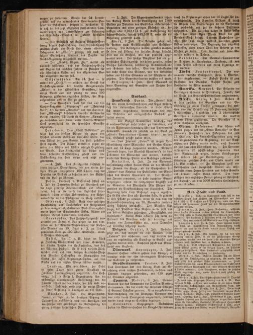 Afrika. Corfu, 1. Juli. Gestern ist es hier zwischen der Garnison und de? Be— völkerung zu einem Conflict gekommen, bei wel⸗ chem von der Bevölkerung 25 Personen, darunter 1 italienischer, 4 türkische und 2 österreichische Unterthanen verwundet wurden. Es wurden mehrere Läden geplündert. Die Garnison ist in ihren Karsernen consignirt.
