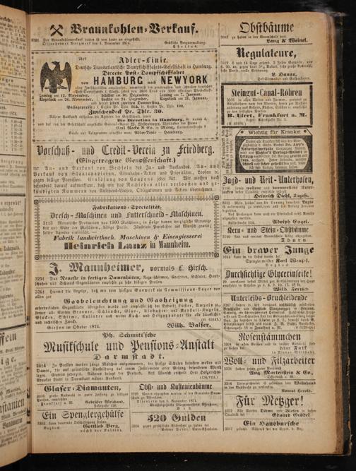 und der von der Gesellschaft angestellte General-Agent W. Westenburger, Theilhaber der Firma 10. 63186.) Carl Nacké S Co. in Mainz, Carmeliterstraße 8 Sen 5 Briefe und Telegramme adressire man: Adler-Linie— Hamburg. 28585 Wichtig für Kranke! Mo- o- ob- ebe- o---- οονεοοο-- οοο-- οοs ꝗ e.]- o ab-- 2 3„r 0 ö 2— 8 Damit alle Kranken sich von der Vor⸗ 0 nn 18 85 e 1 78 0 2„S iguchteit d. illustr. Buches Pr. Airy's“ J rsd 49 Und 8 Tedit 1 klein U Lil kl. E Naturheilmethode überzeugen können, Ff Lerchen s 4 F 55 von Nichter's Verlags⸗Anstalt 5 5 a 2 702* 2(S= eipzig ein 80 Seit. stri. Auszug gratis und (Eingetragene Genosseuschaft.) 2 3 frco. versandt. Jeder Leidende, welcher 2 5 8 5 5 1 1 5s cchnell und sicher geheilt sein will, sollte h An- und Verkauf von We chseln des In- und Auslandes. An⸗ und Gs— 41 lassen. Verkauf von Staatspapieren, Eisenbahn-Actien und Prioritäten, Loosen ꝛc. SS 8