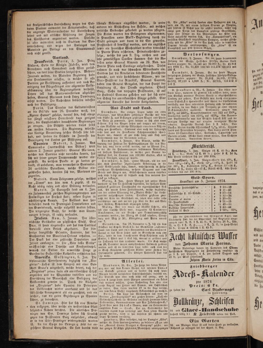 Frankfurt am 5. Januar 1874. Preußlsche Friedrichsd'or. fl. 9 58—59 istesen:„ 9 4ʃ—43 Holländische fl. 10-Stücke.„5 9 52—54 Dieglen,„ 5 32—34 Ducaten al mares„5 5 33—35 20-Frankenstücke.„ 9 21—22 Engsische Sovereigns 1 11 49—51 Nussische Imperiales.„ 0 42—44 Dollars in Gold..„ 22 29½