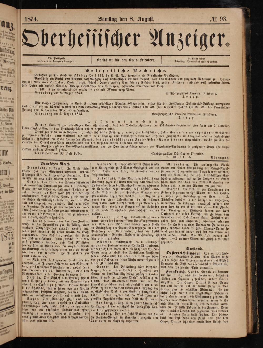 Zeitung vom 6. laufenden Monats) aufmerksam. Friedberg am 6. August 1874.