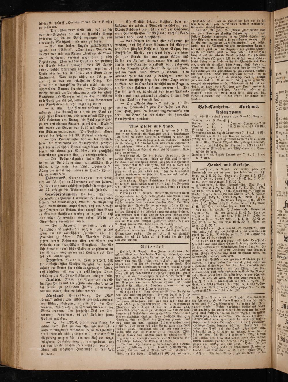 Gießen. In der Nacht vom 4. auf den 5. d. M. sand in der Neustadt eine Schlägerei zwischen Studirenden statt, wobei die Köpfe bedeutend herhielten; es beiheiligte sich dabei ohne Veranlassung auch ein Soldat.— Ueber die Entsteyung des Streites kann man eiwas Bestimmtes nicht erfahren. Wäre nicht die Polizei eingeschritten, dann hätte die Schlägerei sicherlich einen viel schlimmeren Aus— gang genommen.