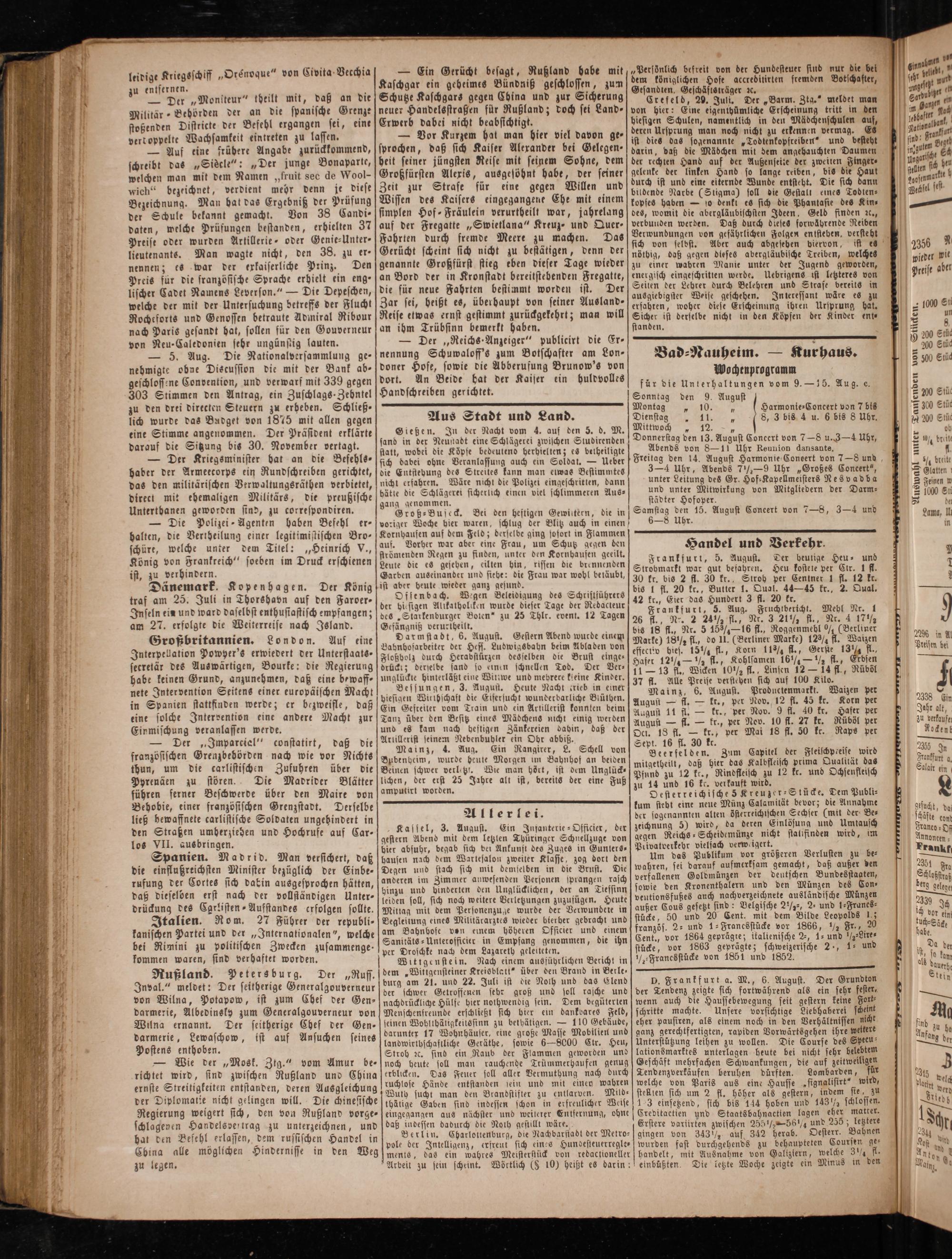 Frankfurt, 5. August. Der heutige Heu⸗ und Strobmarkt war gut befahren. Heu kostete per Cir. 1 fl. 30 kr. bis 2 fl. 30 kr. Stroh per Centner 1 fl. 12 kr. bis 1 fl. 20 kr., Butter 1. Qual. 44—45 kr., 2. Qual. 42 kr., Eier das Hundert 3 fl. 20 kr.