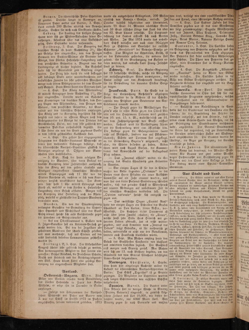 Bremen. Die österreichische Polar Expedition ist gerettet. Dieselbe langte in Norwegen an. Lieutenant Payer meldet aus Vardoe, 3. Sept.: Land entdeckt 200 Meilen nördlich von Nowaja Semlja. Sachen für mich nach Christiania schicken.
