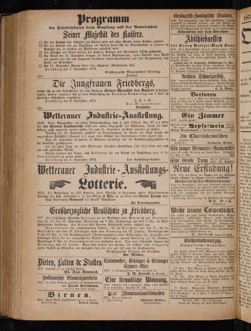 welche sich an den Festlichkeiten bei dem Empfang Seiner Majestät des Kaisers betheiligen wollen, werden eingeladen sich zu einer Besprechung am Dienstag-Nachmittag um 4 Uhr im städtischen Schulhause einzufinden. Friedberg den 8. September 1874.„ Der Beigeordnete