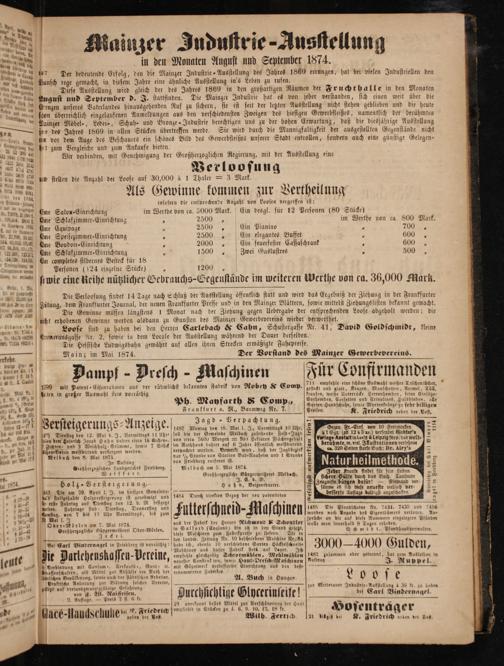 in den Monaten August und September 1874. 7 Der bedeutende Erfolg, den die Mainzer Industrie-Ausstellung des Jahres 1869 errungen, Vunsch rege gemacht, in diesem Jahre eine ähnliche Ausstellung in's Leben zu rufen. Diese Ausstellung wird gleich der des Jahres 1869 in den großartigen 1 und September d. J. stattfinden. venzen unseres Vaterlandes hinausgehenden