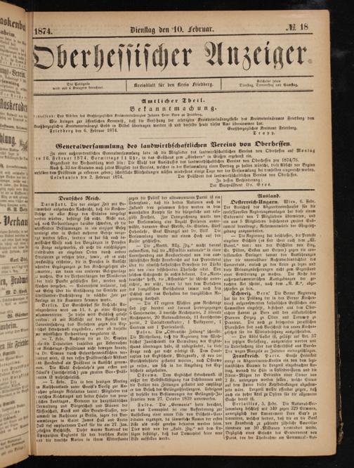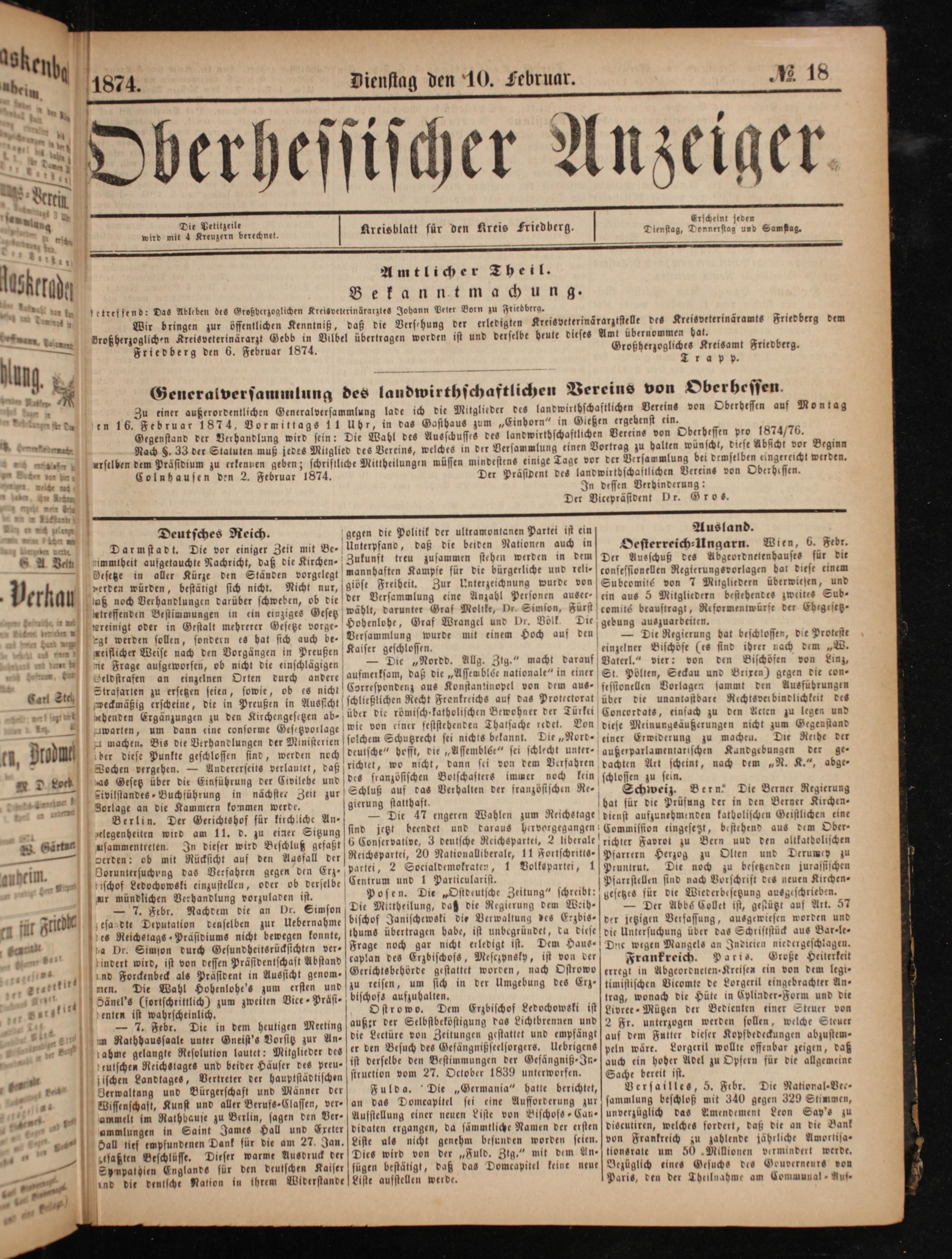 Na, Zu einer außerordentlichen Generalversammlung lade ich die Mitglieder des landwirthschaftlichen Vereins von Oberhessen auf Montag en en 16. Februar 1874, Vormittags 11 Uhr, in das Gasthaus zum„Einborn“ in Gießen ergebenst ein. 5 1 Gegenstand der Verhandlung wird sein: Die Wahl des Ausschusses des landwirthschaftlichen Vereins von Oberbessen pro 1874/76. — Nach H. 33 der Statuten muß jedes Mitglied des Vereins, welches in der Versammlung einen Vortrag zu halten wünscht, diese Absicht vor Beginn „ Wan uerselben dem Präsidium zu erkennen geben; schriftliche Mittheilungen müssen mindestens einige Tage vor der Versammlung bei demselben eingereicht werden. 7 de Colnhausen den 2. Februar 1874. Der Präsident des landwirtbschaftlichen Vereins von Oberhessen. 2 In dessen Verhinderung: e* Der Vicepräsident Dr. Gros. e Deutsches Reich. gegen die Politik der ultramontanen Partei ist ein Ausland. n Dar mstadt. Die vor einiger Zeit mit Be- Unterpfand, daß die beiden Nationen auch in Oesterreich⸗Ungarn. Wien, 6. Febr. A Jam immthbeit aufgetauchte Nachricht, daß die Kirchen- Zukunft treu zusammen stehen werden in dem Der Ausschuß des Abgeordnetenhauses für die