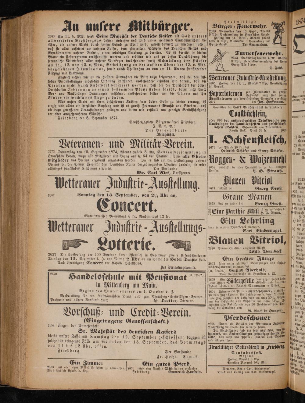 solche für dringende Fälle am Sonntag den 13. September, des Vormittags von 11 bis 12 Uhr, offen. Friedberg.