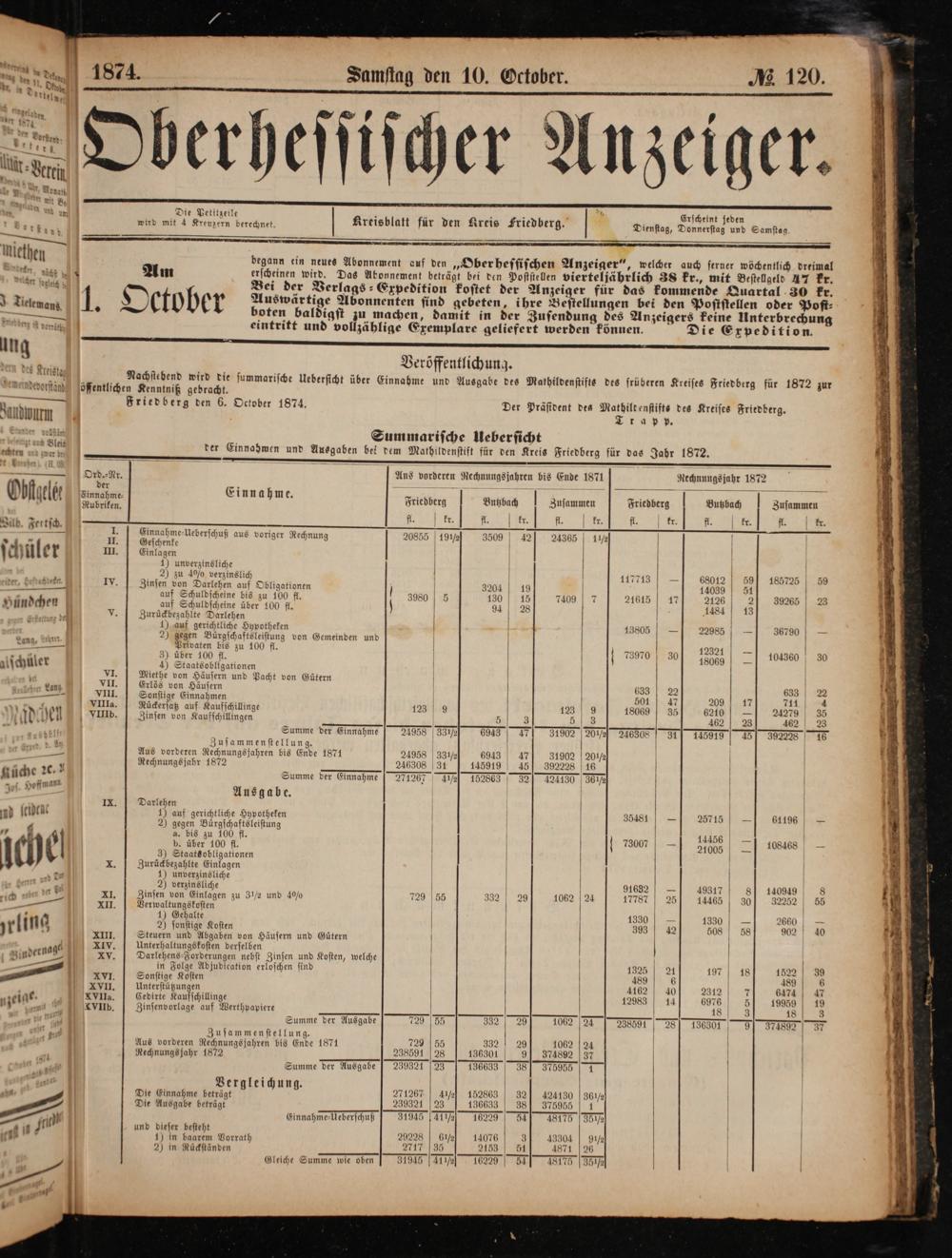 summarische Uebersicht über Einnahme und Ausgabe des Mathildenstifts des srüberen Kreises Friedberg für 1872 zur