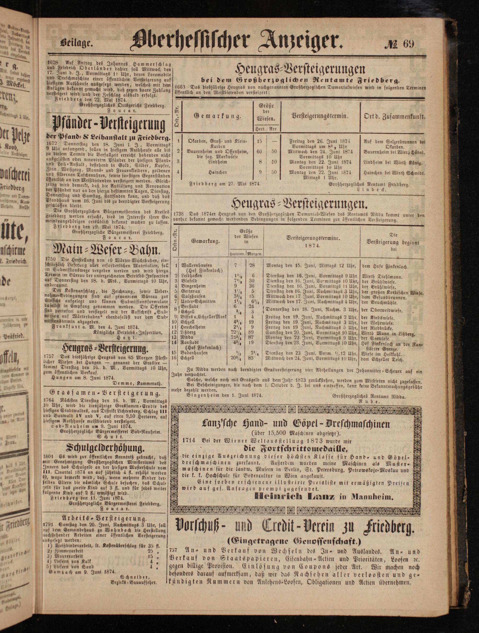 1628 Auf Antrag des Johannes Hammerschlag und Friedrich Oberländer dahier soll Mittwoch den 17. Juni d. J., Vormittags 11 Uhr, deren Locomobile und Dreschmaschine einer öffentlichen Versteigerung auf biesigem Rathhause ausgesetzt werden, welches mit dem Anfügen bekannt gemacht wird, daß gegen baare Zahlung versteigert wird und der Zuschlag alsbald erfolgt. Friedberg den 22. Mal 1874. Großherzogliches Ortsgericht Friedberg. enn