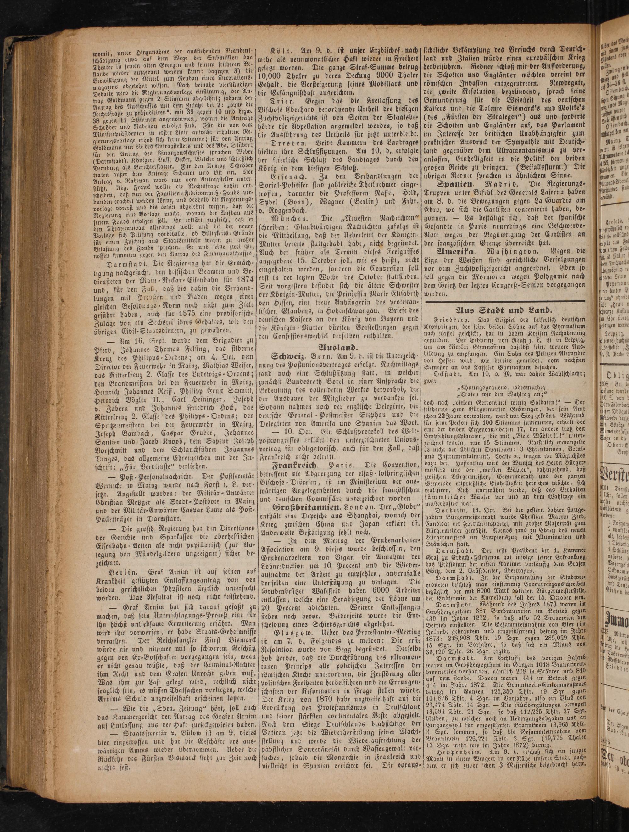 Darmstadt. Am Schlusse des vorigen Jahres waren im Großherzogthum im Ganzen 1018 Branntwein⸗ brennereien vorhanden, nämlich 208 in Städten und 810 auf dem Lande. Davon waren 444 im Betrieb gegen 414 im Jahre 1872. Die Branntwein⸗Einkommensteuer betrug im Ganzen 125,350 Thlr. 19 Sgr. gegen 10,876 Thlr. 4 Sgr. im Vorjahre, also ein Plus von 23,474 Thlr. 14 Sgr.— Die Rückvergütungen betrugen 13,094 Thlr. 21 Sgr., so daß 112,225 Thlr. 27 Sgr. bleiben, zu welchen noch an Uebergangsabgaben und an Eingangszoll für eingeführten Branntwein 13,965 Thlr. 3 Sgr. kommen, so daß die Gesammteinnahme vom Branntwein 126,221 Thlr. 2 Sgr.(19,776 Thaler 13 Sgr. mehr wie im Jahre 1872) betrug.