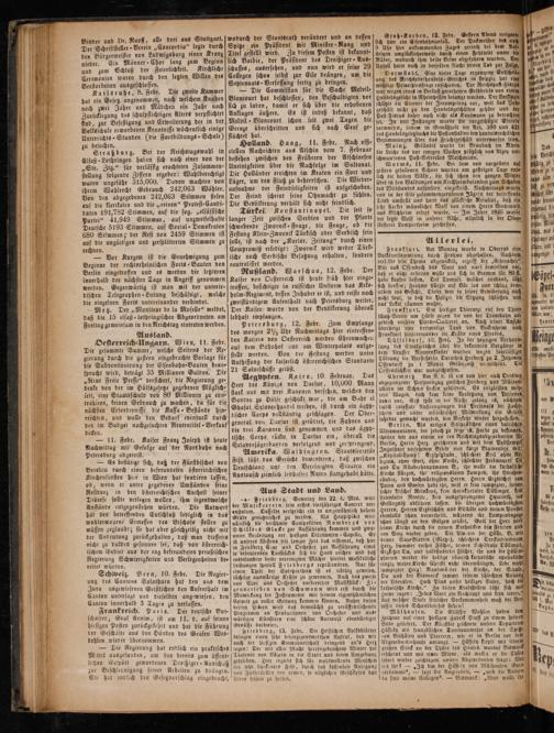 Oesterreich⸗Ungarn. Wien, 11. Febr. Die gesammte Summe, welche Seitens der Re⸗ gierung durch die gestern eingebrachte Vorlage für die Subventionirung der Eisenbahn-Bauten bean- sprucht wird, beträgt 35 Millionen Gulden. Die „Neue Freie Presse“ versichert, die Regierung ge— denke von der im Hülfsgesetze gegebenen Möglich- keit, eine Staatsschuld von 80 Millionen zu con- trahiren, keinen Gebrauch zu machen, da für die nächsten Erfordernisse die Kassa-Bestände hin- reichten, und wolle den Bedarf eventuell durch den im Budget nachgesuchten Rententitel⸗Verkauf decken.
