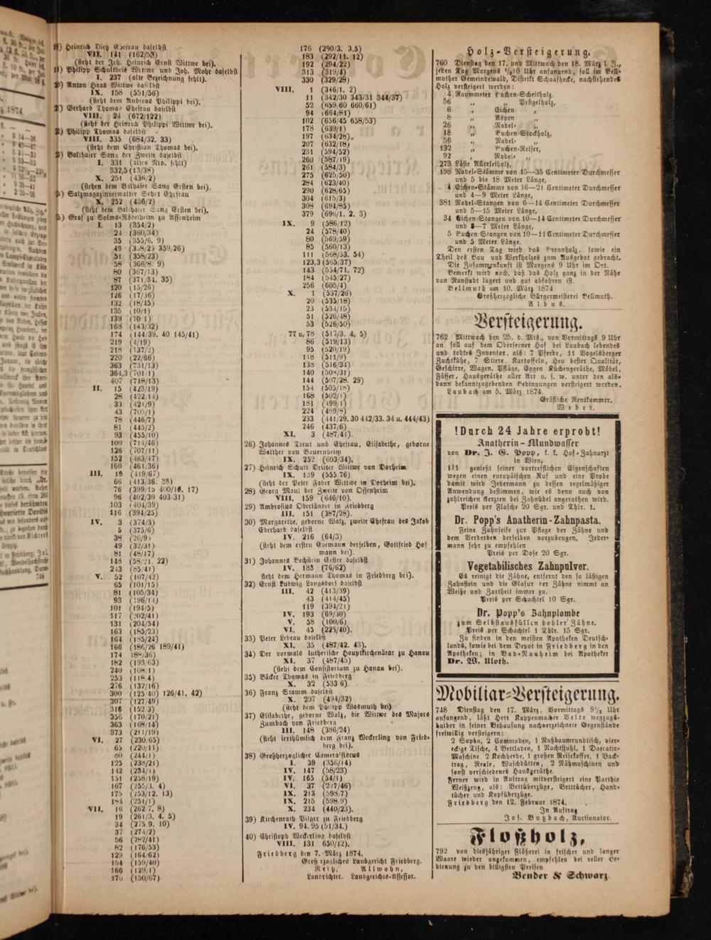 81(105/84) 111. 42(413,9) Weiße und Zartheit inner— Zähne nimmt an 93(196 2 delt li zu. 107 0194 30 I. 39½1 Preis per Schachtel 10 Sgr. 117(202/41) Iv. 193(69%0) Dr. Popp's 3 131(204¼54) v. 58(100,6) 4 1 5 Bahn plen de 163(185/23) vI. 15(225/40). 1 Frede 10 N. 1* bobler Zähne. 164(185/24) 33) Peter Lebeau daselbst gu find 8. Tblr.* Sgr. b 186(187/26 189/41 XI. 35(487/42. 43).* A 2 8 Apotheken Deutsch⸗ 1 174 188,36) 34) Der vormals lutherische Haupikirchenärar zu Hanau 3 in re 1*. 37(4¼) br. W. ulotb. 0 240(108/01)(siebt dem Consistorium zu Hanau bei). 253(1184) 35) Bäcker Tbomas in Friedberg 1 5(132/16) K. MN I333. NJ . 00(125 40) 126/41. 42) 36) Franz Stamm daseldst M 111 N 5 4 — 1 00 1 e e Mobiliar-Versteigerung. 316(152 3)(ücht dem Popp Wasmuth bei) 748 Oi 4 f. g 356(1470/1) 37) Elisabeide, geborne Walz, die Wipe des Majors] lenstag den 17. Min, Vormittags 9½ Uhr 363(168¼/ö14) Zumbach von Friedberg anfangend, laͤßt Herr Kappenmacher Vehte wegzugs⸗ 373(20/19) III. 148(386/24) faltig— Behausung nachverzeichnete Gegenstaͤnde * VI. 7(230/65 eht irrthümlich dem Franz Weckerling v„ freiwiäl versteigern: * 65 230 15 es en e 3 n 1 1e vier⸗ * 80(244/ eckige Tische, 4 Bettladen, 1 Nachtstuhl, 1 Daecatir⸗ — 125 23%) 38) wanne Maschine 2 Kochberde, 1 großen Reisekoffer, 1 Back⸗ 5 112(23/1) 1v. 147(88/23)— 3 W e 5 Naͤhmaschinen und 151(258/19) 1 onst verschiedenes Hausgeräthe a 167(23/3. K 5 7(247% Ferner wird in Auftrag mitverstelgert eine Parthte 175(253/12. 13) IX. 213(598,7) 8 e e Betttücher, Hand⸗ 14(25½¼½ IX 5(598 ücher und Kopfüberzüge. VII. 16(2627. 8) X. 3(44025). Friedberg den 12. Februar 1874. * 19(26½½. 4. 5. Nu. Auftrag 34(2759. 100 39) a 7 e. Jo s. 8 uh da ch, Auctlonator. 37(274%) ö 225 N 56(282/41) 40) Christoph Weckerling daselbst 15 0 n 0 0 f 92(176/58) VIII. 131 650/12). 7 3. „ ö 127(464 62) Friedberg den 7. März 1874. 792 von dlesfähriger Fl öberel in frischer und langer 1 1 154(1%) Groß rzogliches Landgericht Friedberg. Man, wieder angekommen, empfeblen det reller Be— N 166(14, 1 N eig, Allwobn, dienung zu den billigsten Pretsen 170(1650/67) Landrichter. Landgerichts Assessor. Bender& Schwarz.