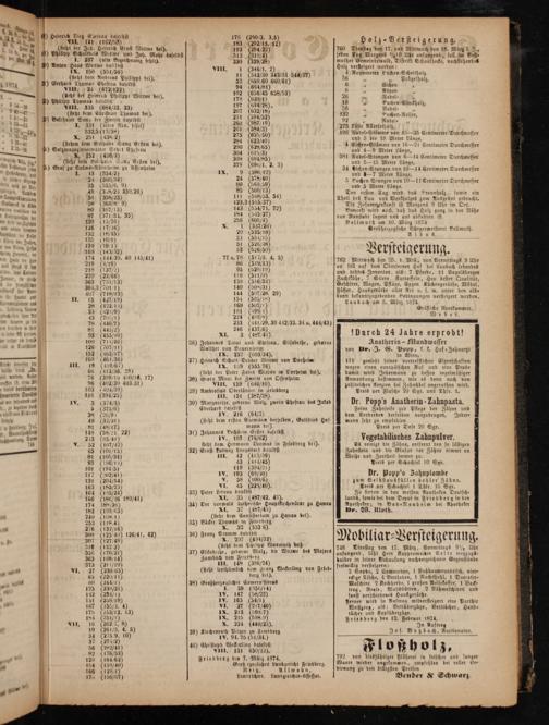 iind den Jun 135(10/1) 23(534¼ö15 Albus. Juli 1109 b eam den 139(101) 51(526/48) 2 ee* 8* 3 J*** f— 168(143¼2) 53(526/50) 8 ö 3 g. n bes 174(14439. 40 14/41) 77 u. 78(517/. 4. 5) 7 i 7— er tei erung n u 219(4¼19) 86(319/13) 762 Mittwoch den 25. d. Mts., von Vormittags 9 Ubr 1 Cunn 218(1/0) 95(520/19) an soll auf dem Oberseener Hof bei Laubach lebendes 1 220(22/66) 118(314½%) und todtes Inventor, als: 7 Pferde, 11 Vogelsberger W 363(234/13) 138(516/33) Zuchtenbe, 7 Stiere. Kartoffeln, Heu bester Qualität, 1 364,3(70101) 140(50¾81) Geschirre, Wagen, Pflüge, Eggen Küchengeräthe, Möbel, 1 407(718/ö13) 144(507/28. 29) Fässer, Hausgeräthe aller Art u. s. w. unter den als⸗ — 1 II. 15(423/19) 154(505/18) dann bekanntzugebenden Bedingungen versteigert werden. 1 3 28(422514 168(50% Laubach am 5. März 1874 9 0 1 33 0 42½/9) 181(99 N Gräfliche Rentkammer. 5* 43(705%) 224(489/85) Weber. d u 78(446/79) 233 01 20. 30 442/33. 34 u. 44%.- * 81(44%%) 246(4327/6) 1 0 0 xl. 3(48/4). Durch 24 Jahre erprobt! e 126 6707/11 26 Jebannes Treut und Cheftau, Elisabethe, geborne Anatherin- Mundwasser d„ W don Ba 2 c 180 17550 ei 252(60334 von Du. J. G. 1* k. t. Hof ⸗Zahnarzt 0(461/36) 7 1 8 218 8 1 J 5 in Wien,