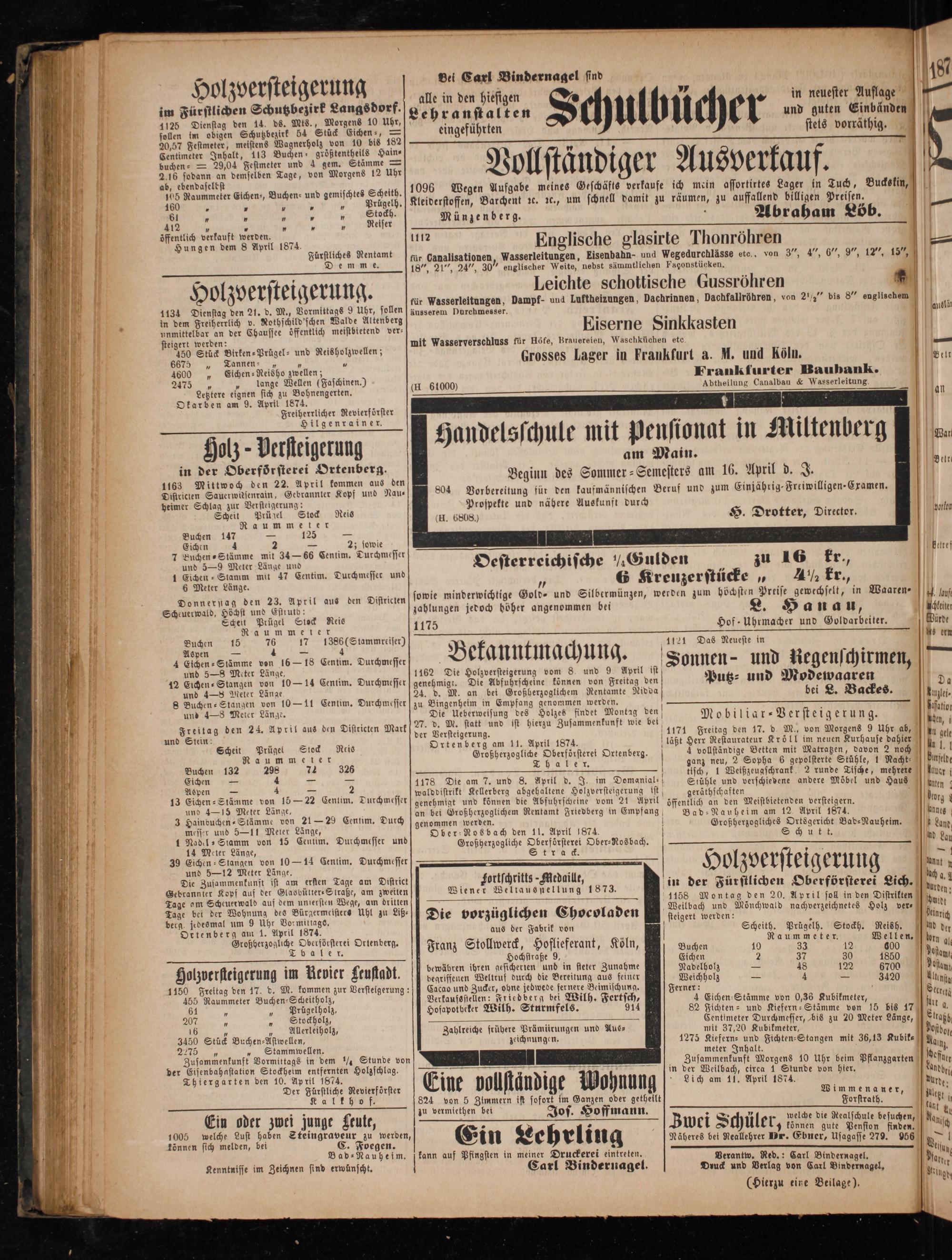öffentlich verkauft werden. Hungen dem 8 April 1874. Fürstliches Rentamt