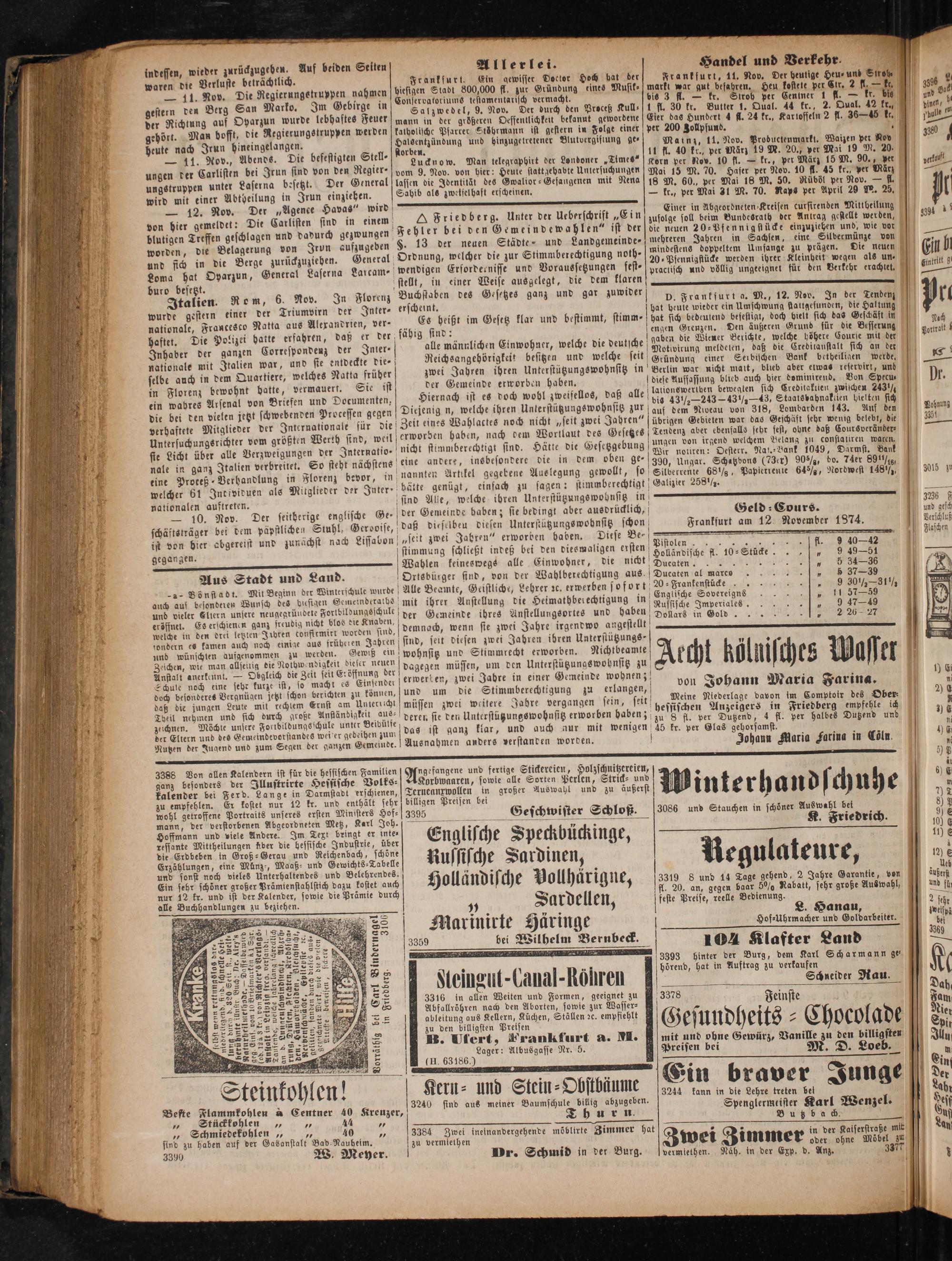 Frankfurt am 12 November 1874. Pen fl. 9 40—42 Holländische fl. 10-Stücke.„ 9 49—51 Dachtenß;„ 5 34—36 Ducaten al marco„ 5 37-39 20-Frankenstücke„ 9 30½—31½ Englische Sovereigns„ 11 57-59 Russische Imperiales.„ 9 47—49 Dollars in Gold. 2