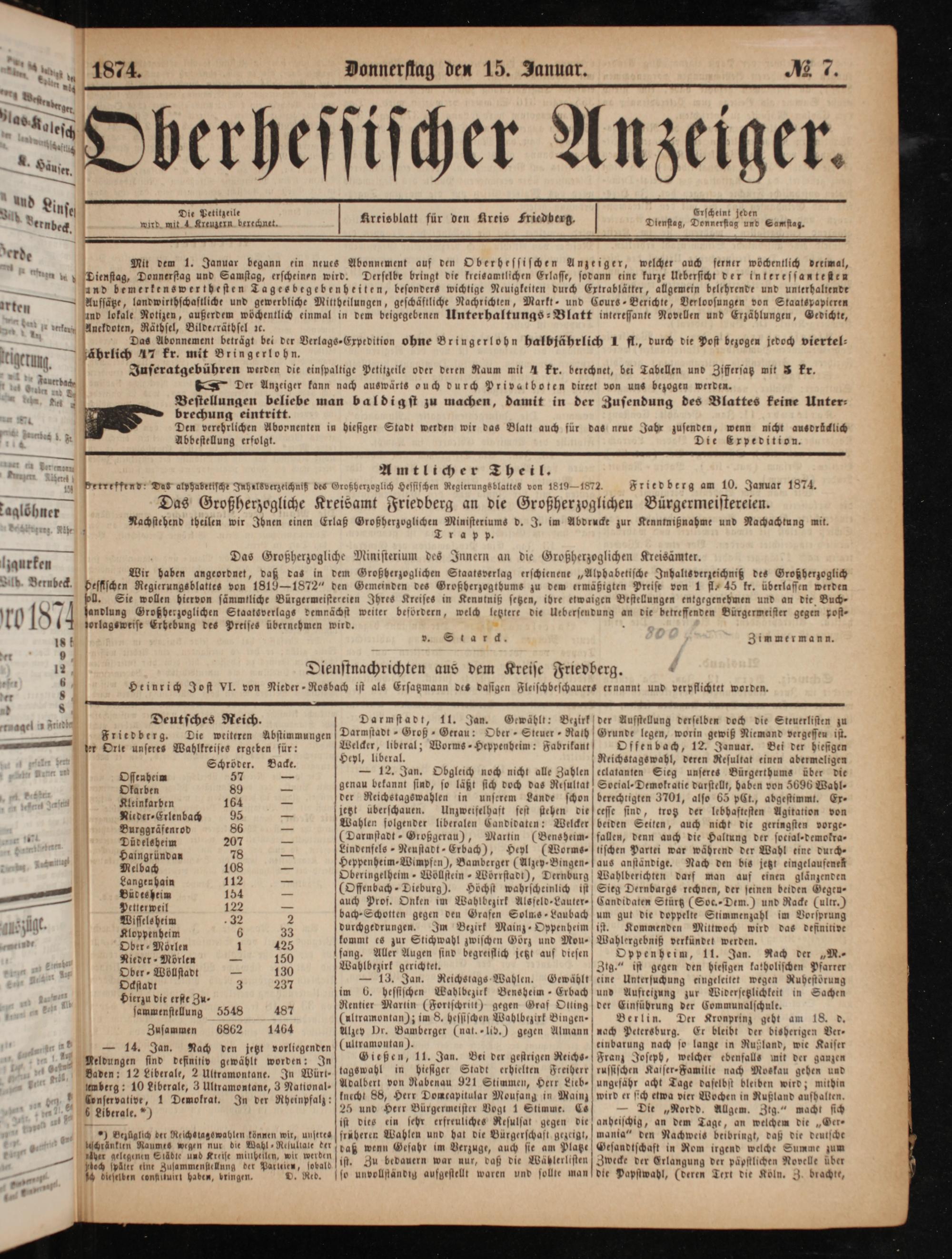 Mit dem 1. Januar begann ein neues Abonnement auf den Oberhessischen Anzeiger, welcher auch ferner wöchentlich detimal, Dienstag, Donnerstag und Samstag, erscheinen wird. Derselbe bringt die kreisamtlichen Erlasse, sodann eine kurze Uebersicht der interessantesten und bemerkenswerthesten Tagesbegebenheiten, besonders wichtige Neuigkeiten durch Extrablätter, allgemein belehrende und unterhaltende