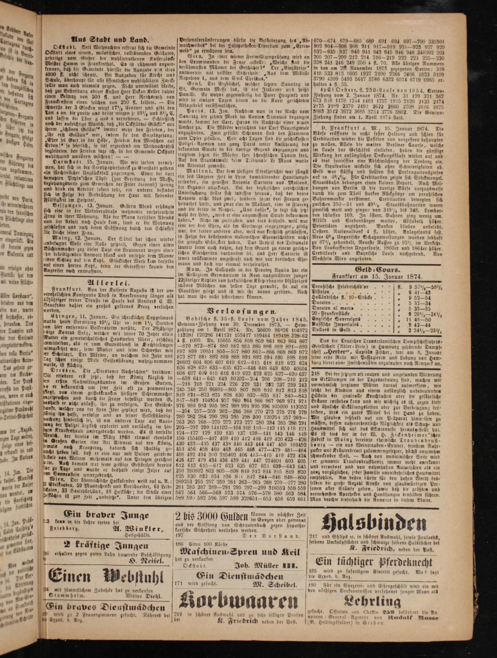 Frankfurt am 15. Januar 1874. Preußlsche Friedrichsd or fl. 9 57½%—58½½, F* 941-43 Holländische fl. 10⸗Stücke„ 9 52—54 G„ 5 32—34 Ducaten al mates„ 5 33—35 20 Frankenstücke.„ 9 20½—24½ Englische Sovereigns„ 11 48—50 Kussische Impertales„ 912—44 Dollars in Gold„ 224½½— 3