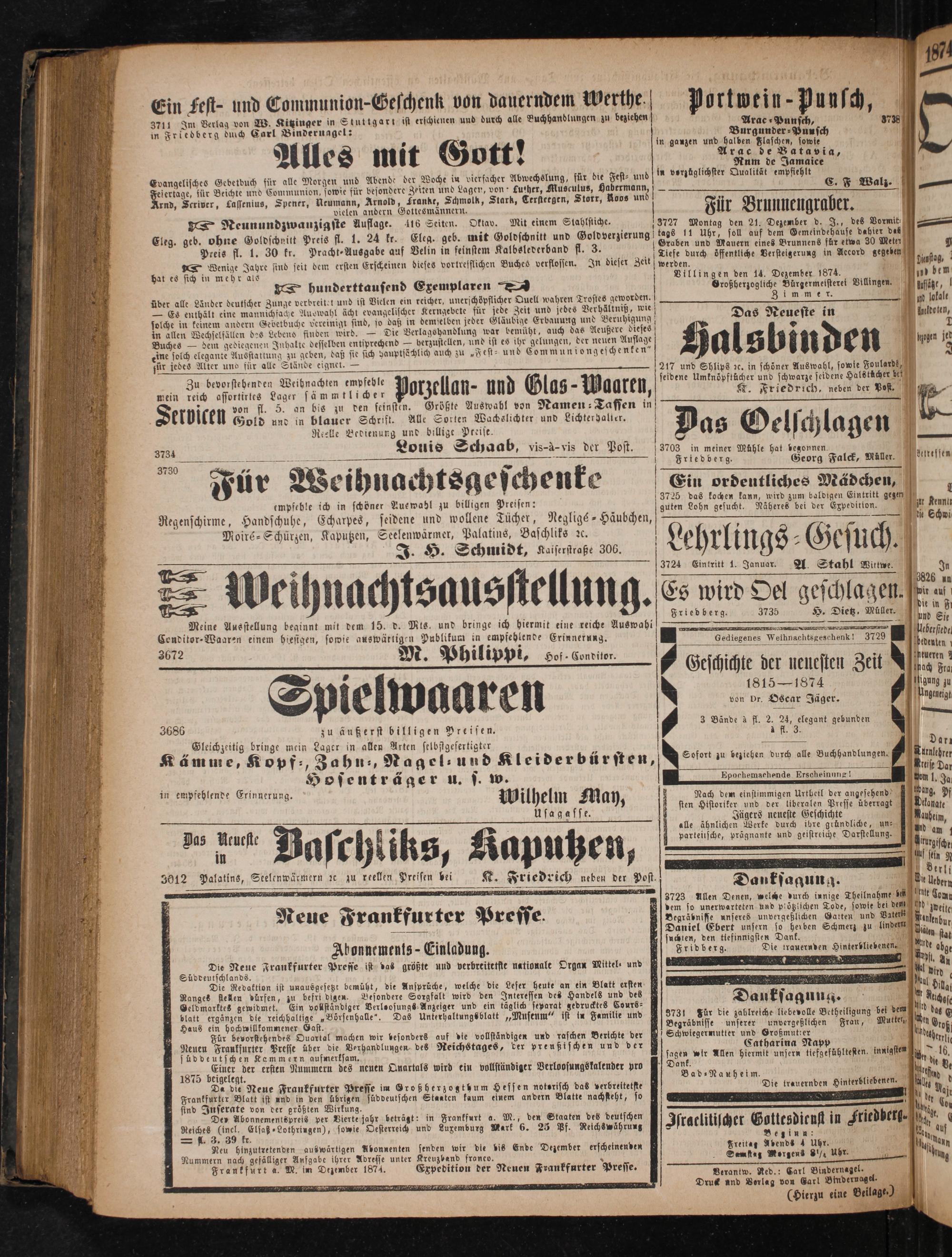 Nummern nach gefälliger Anfgabe ihrer Adresse unter Kreuzband franco. 1 Frankfurt a. M. im Dezember 1874. Expedition der Neuen Frankfurter Presse.