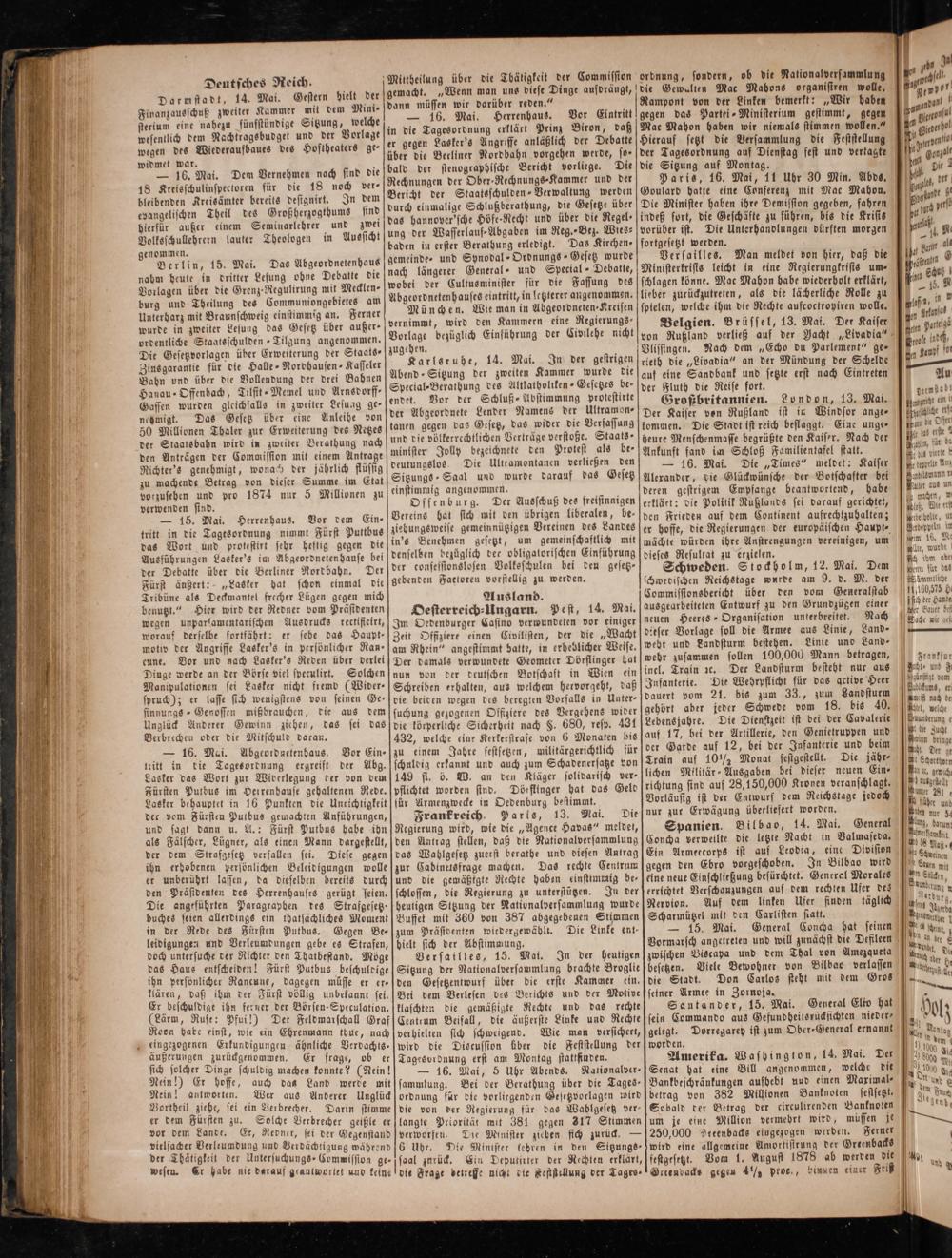 zwischen Biscaya und dem Thal von Amezqueta besetzen. Viele Bewohner von Bilbao verlassen die Stadt. seiner Armee in Zornoja. Santander, 15. Mai. sein Commando aus Gesundheitsrücksichten nieder⸗ gelegt. worden. Amerika. Washington, 14. Mai. Der Senat hat eine Bill angenommen, welche die Bankbeschränkungen aufhebt und einen Maximal- betrag von 382 Millionen Banknoten festsetzt. Sobald der Betrag der circulirenden Banknoten um je eine Million vermebrt wird, mussen je 250,000 Yecenbacks eingezogen werden. Ferner wird eine allgemeine Amottistrung der Greenbacks festgesttzt. Vom 1. August 1878 ab werden die