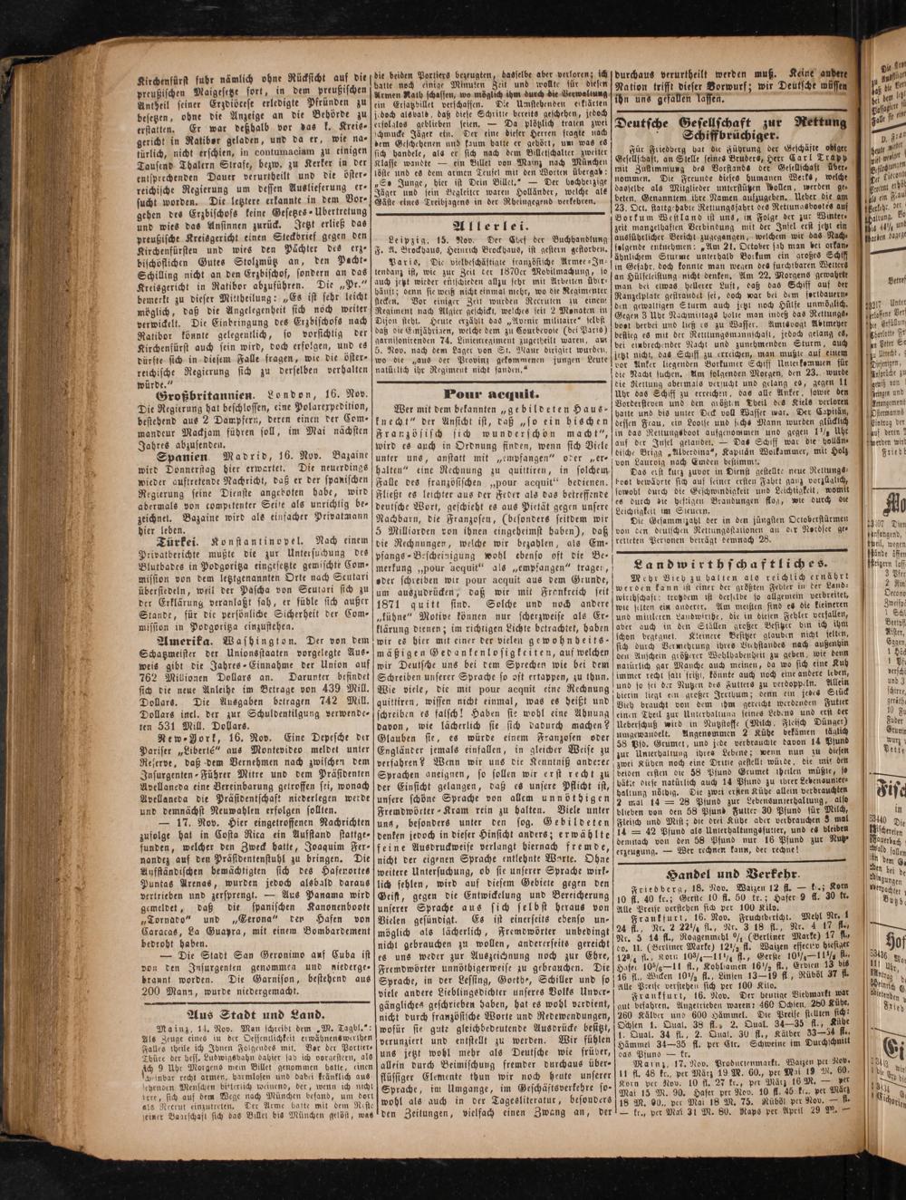 Frankfurt, 16. Nov. Fruchtbericht. Mehl Nr. 1 24 fl. Nr. 2 22½ fl., Nr. 3 18 fl., Nr. 4 17 fl., Nr. 5 14 fl., Roggenmehl%(Berliner Marze) 17 fl, do. II.(Berliner Marke) 12½ fl. Waizen effectev hiesiget 12% fl., Korn 1011 ½ fl., Gerßte 10¼—11½ fl., Hafet 105— 11 fl., Kohlsamen 16 ½ fl., Erbsen 13 bis 16 fl., Wicken 10½ fl., Linsen 13—19 fl. Rüböl 37 fl. Alle Preise verstehen sich per 100 Kilo.