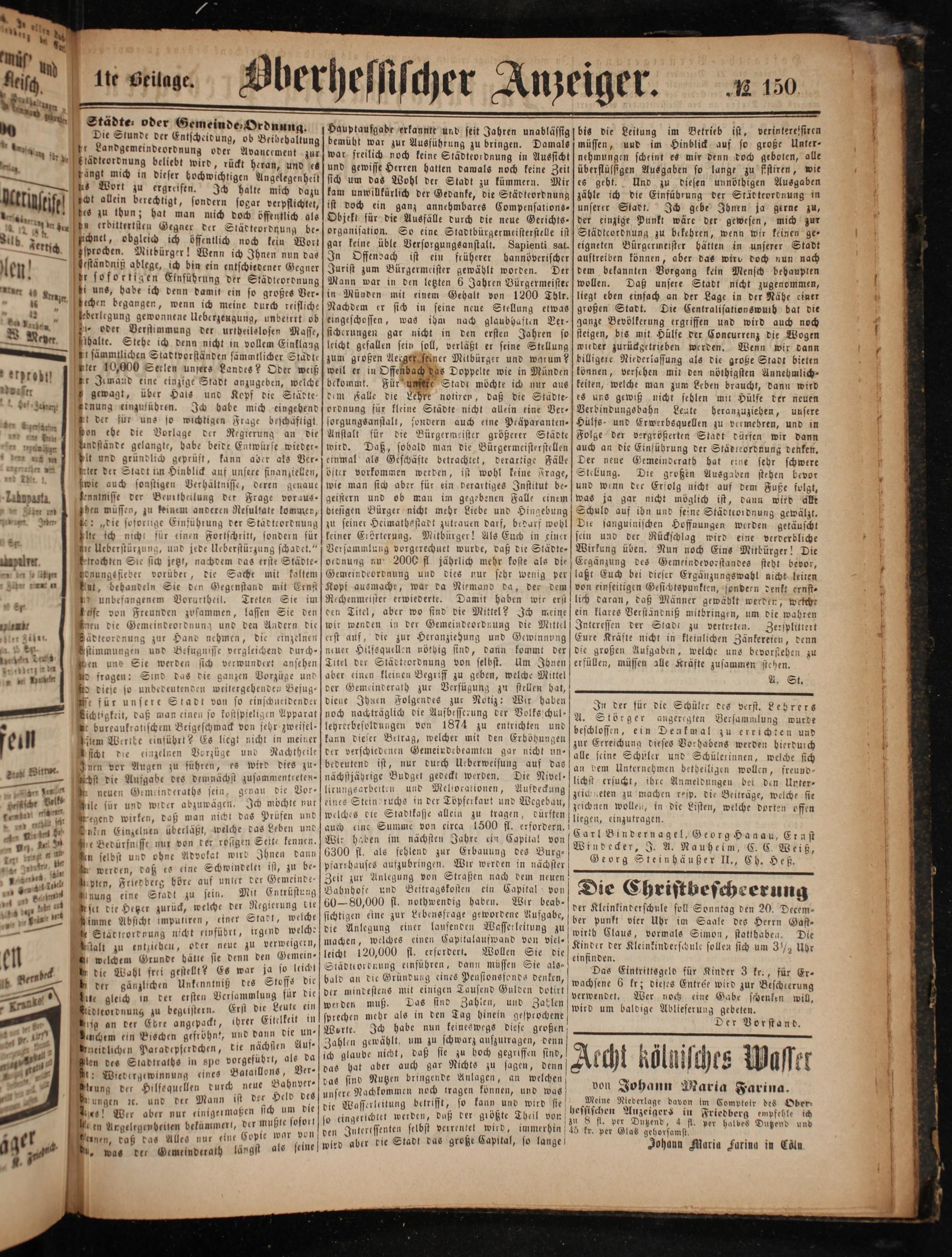 1— Achst die Aufgabe des demnächst zusammentreten- en ee neuen Gemeinderaths sein, genau die Vor⸗ detiche Vell ile für und wider abzuwägen, Ich möchte nur — 1 egend wirken, daß man nicht das Prüfen und 5 117 Unken Einzelnen überläßt, welche das Leben und 22. de Bedürfnisse nur von der rosigen Seit, kenn. tnt dug a n selbst und ohne Advokat wird Ihnen dann e ee, e werden, daß es eine Schwindeler ist, zu be⸗ 15 epten, Friedberg höre auf unter der Gemeinde 2 ae nung eine Stadt zu sein. Mit Entrüstung — 2 uin ud set die Hetzer zurück, welche der Regierung die ——— imme Absicht imputiren, einer Stadt, welche — Städteordnung nicht einführt, irgend welche