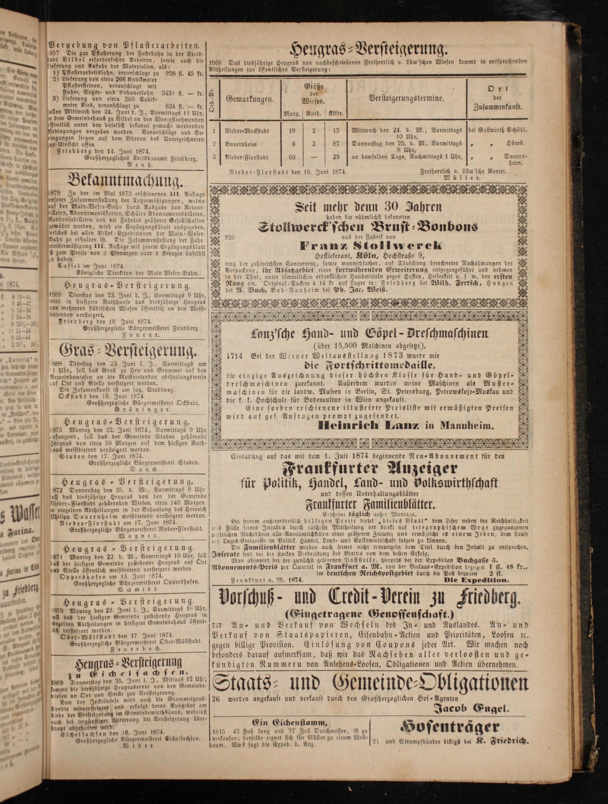 dietend 2 7 N D* 2* D N 5 N 7 2 2 N V N r Frlevberg den 18 Juni 4874 ET Großherzogliche Bürgermeisterei Friedberg 85— 2 2 5 2 eie 5 f— 0 ö 95 5 1. ff. Lanz'sche Hand- und Göpel-Dreschmaschinen 5 l* Gras 28 zerstei erune 2(über 15,500 Maschinen abgesetzt).— ——„* 5 a 92* 5 a 9 g. 1714 Bei der Wiener Weltausstellung 1873 wurde mir 1 889 Dienstag den 23. Juni l. J., 98 1. N 7 8 2 2 1 Ubr, soll das Gras 1 Heu 2 Grum— die Fortschrittsmedaille, 5——— Jemeindewiesen an die Meistbietenden abtheilur die einzige Auszeichnung dieser höchsten Klasse für Hand ⸗ und Göpel⸗ auf Ort und Stelle verstelgert werden. dreschmaschinen zuerkannt. Außerdem wurden meine Maschinen als Muster⸗