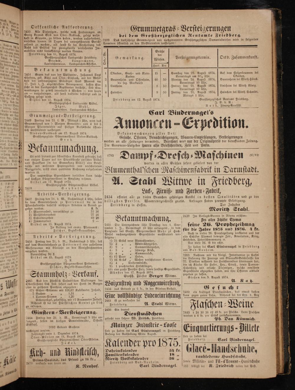 8 Größe 8 der Verstei. 5 auf kunft 3 Gemarkung. Wiesen. ersteigerungstermin. Ort d. Zusammenkunft. 2 Hect. Are 1 Okarben, Groß- und Klein-] 15—] Samstag den 22. August 1874,] Auf dem Selzerbrunnen bei Karben Vormittags um 8 ½ Uhr, Okarben. 2]J Bauernheim und Ossenheim,[60 50 J Montag den 24. August 1874,] Bauernheim bei Wirth Höres. die sog. Markwiese Vormittags 10 Uhr, 3 Lindheim 8 50[Freitag den 21. August 1874,] Lindheim bei Wirth König. Vormittags 10 Uhr, 4J Hainchen 9 50 Freitag den 21. August 1874,[ Hainchen bei Wirth Schmidt. Mittags 1 Uhr, Friedberg am 12. August 1874.