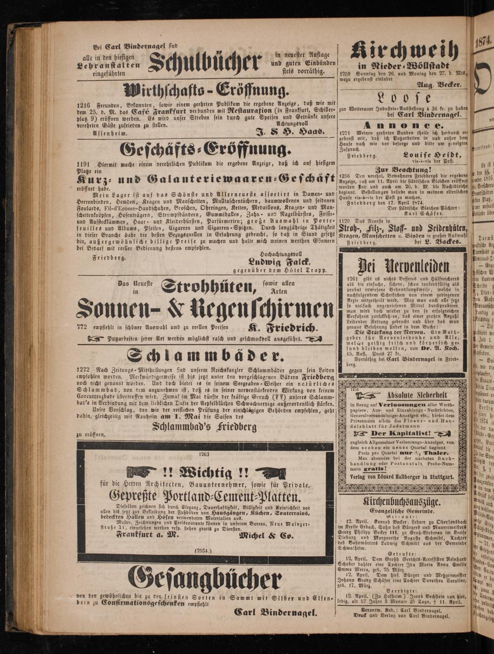 beginnt. Bestellungen beliebe man in meinem elterlichen Hause vis-z-vis der Post zu machen. Friedberg den 17. April 1874. Der städtische Bleichen Pächter: Narl Schäfer. 1120 Das Neueste in