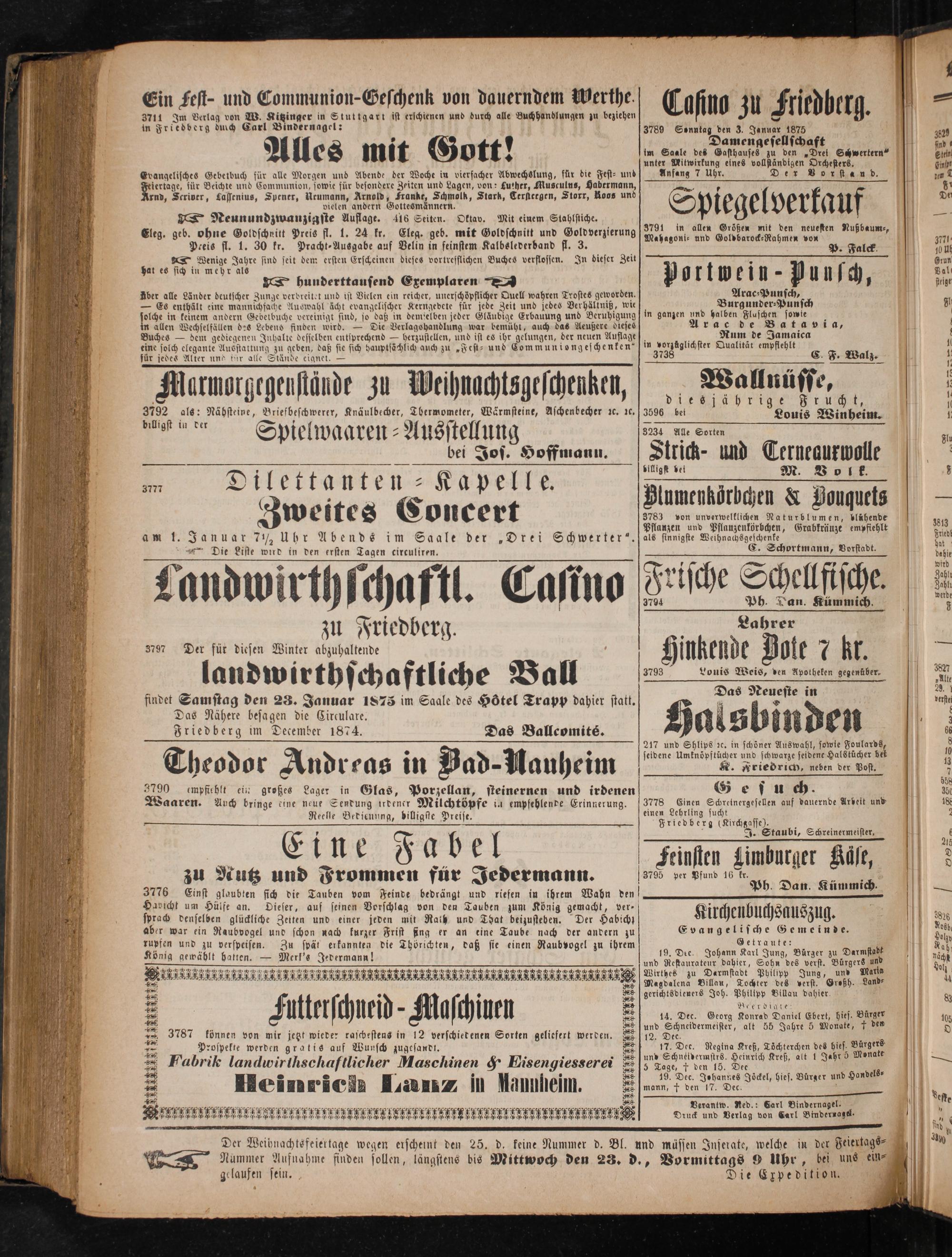 findet e den 23. Januar 1875 im Saale des Hötel Trapp dahier statt. Das Nähere besa gen die Circulare. Friedberg im December 1874.