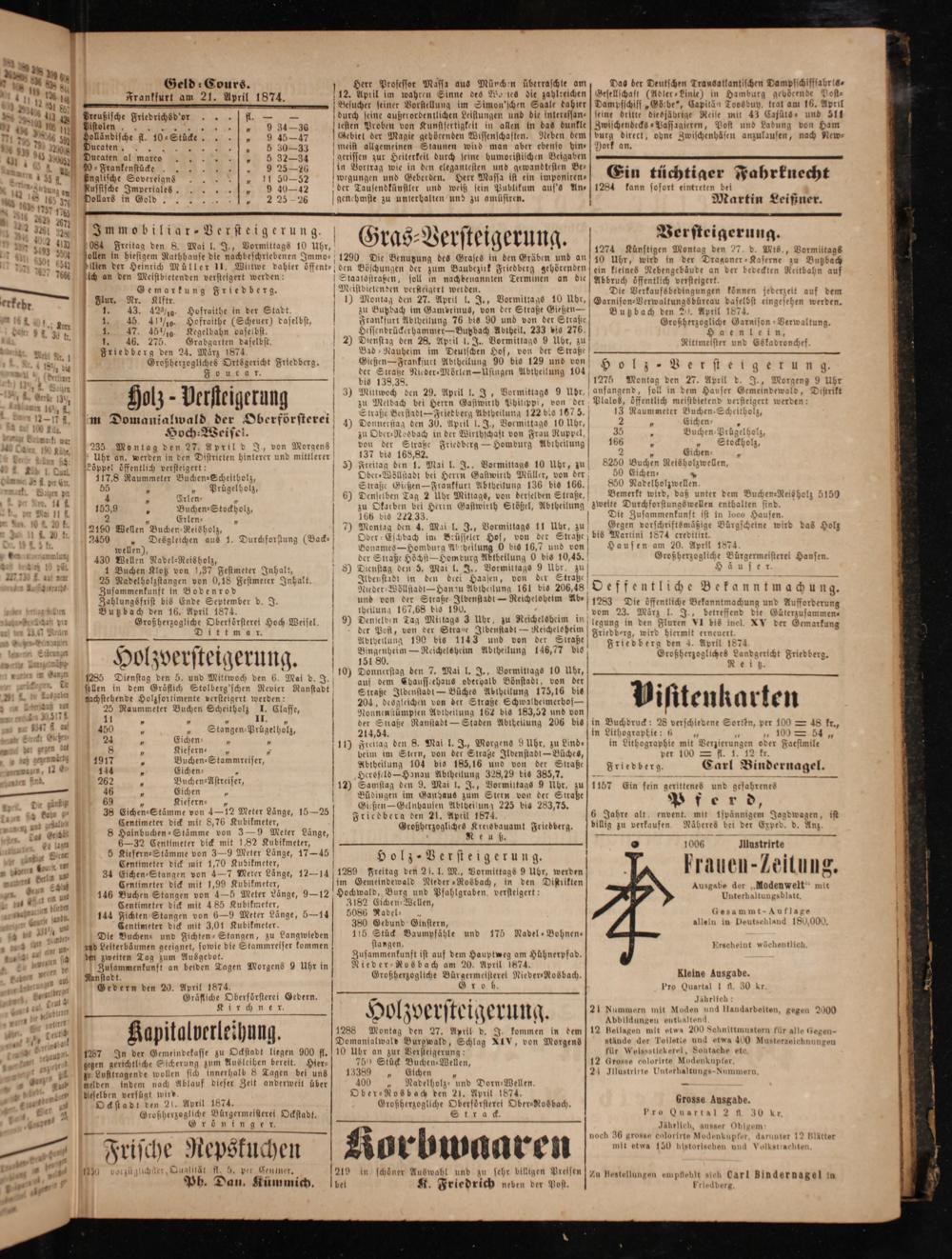 430 Wellen Nadel-Reisholz, 1 Buchen Klotz von 37 Festmeter Inhalt, 25 Nadelholzstangen von 0,18 Festmeter Inhalt. Zusammenkunft in Bodenrod Zahlungsfrist bis Ende September d. J. Butzbach den 16. April 1874. Großherzogliche Oberförsterei Hoch Weisel. Dittmer.