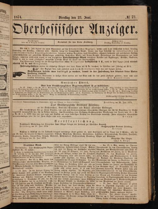 Mit dem 1. Juli beginnt ein neues Abonnement auf den Oberhessischen Anzeiger, welcher auch ferner wöchentlich dreimal, Dienstag, Derselbe bringt die kreisamtlichen Erlasse, sodann eine kurze Uebersicht der interessantesten und
